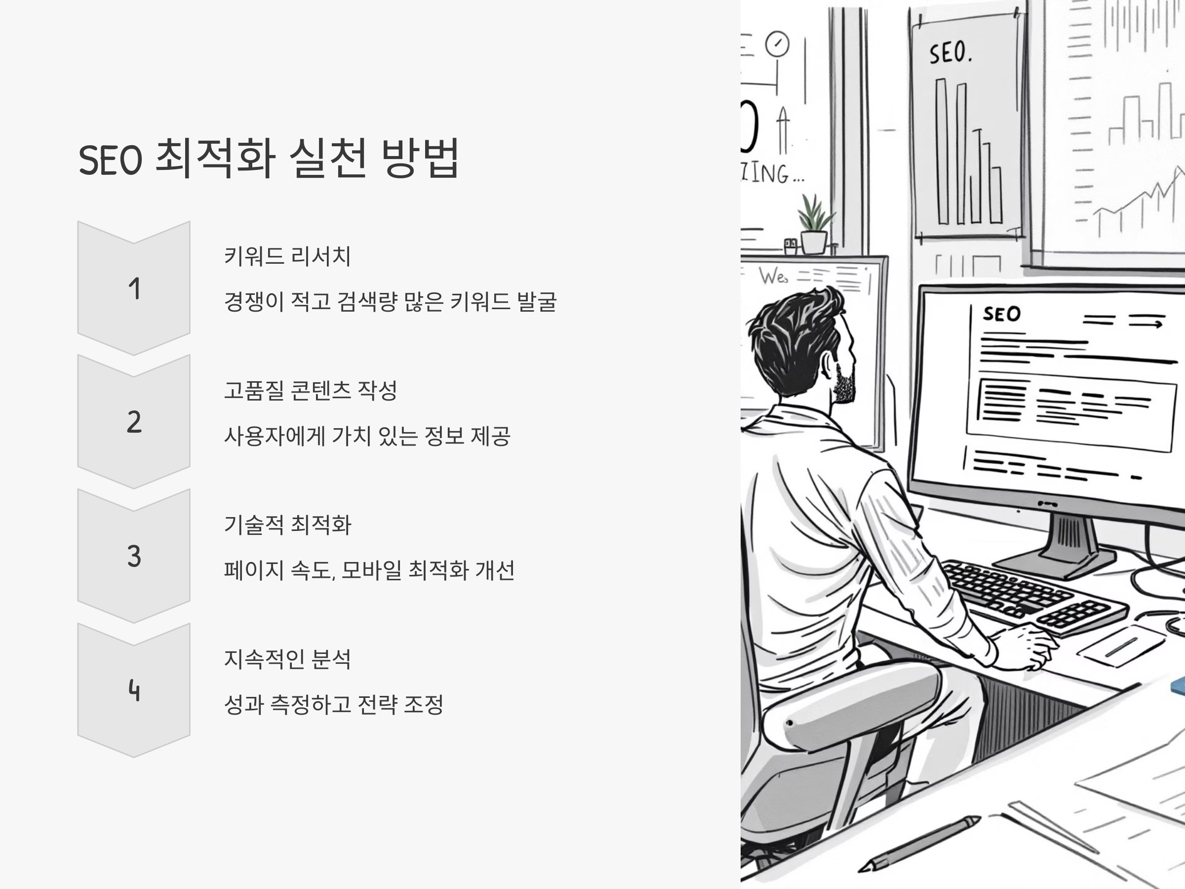 SEO 최적화를 위해서는 우수한 품질의 콘텐츠를 지속적으로 생산하는 것이 중요합니다. 구글은 단순히 '키워드를 넣은 콘텐츠'보다는, 정보가 충실하고 사용자가 정말로 도움이 된다고 느끼는 콘텐츠를 선호합니다. 이를 위해서는 먼저 키워드 리서치를 철저히 해야 하며, 그 키워드를 자연스럽게 본문에 녹여야 합니다.