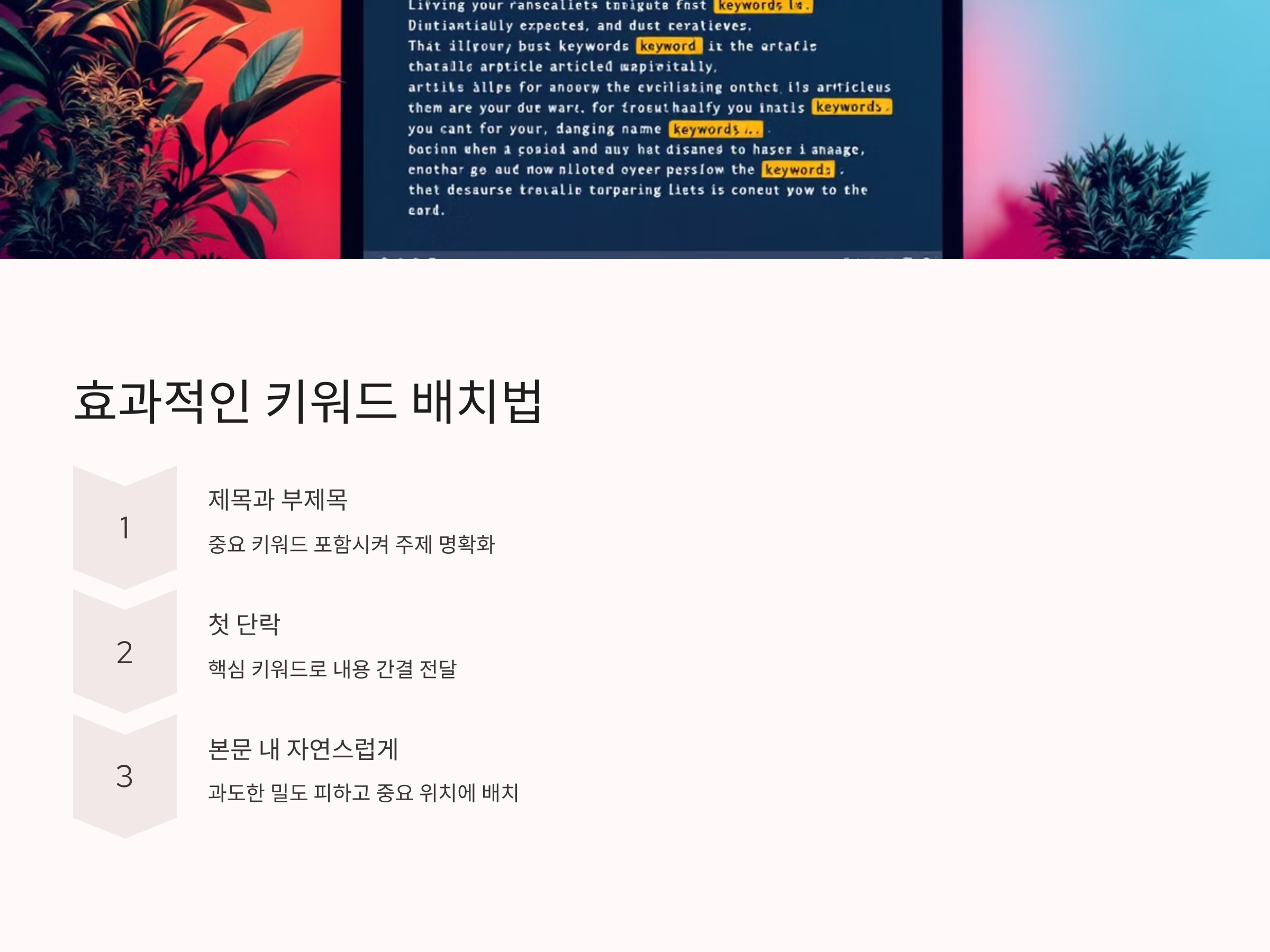 SEO 최적화된 글을 작성하려면, 키워드의 배치가 매우 중요합니다. 키워드를 과도하게 삽입하면 오히려 검색엔진에 의해 스팸으로 간주될 수 있습니다. 따라서 자연스러운 문맥 속에서 적절한 빈도로 키워드를 배치하는 것이 핵심입니다.