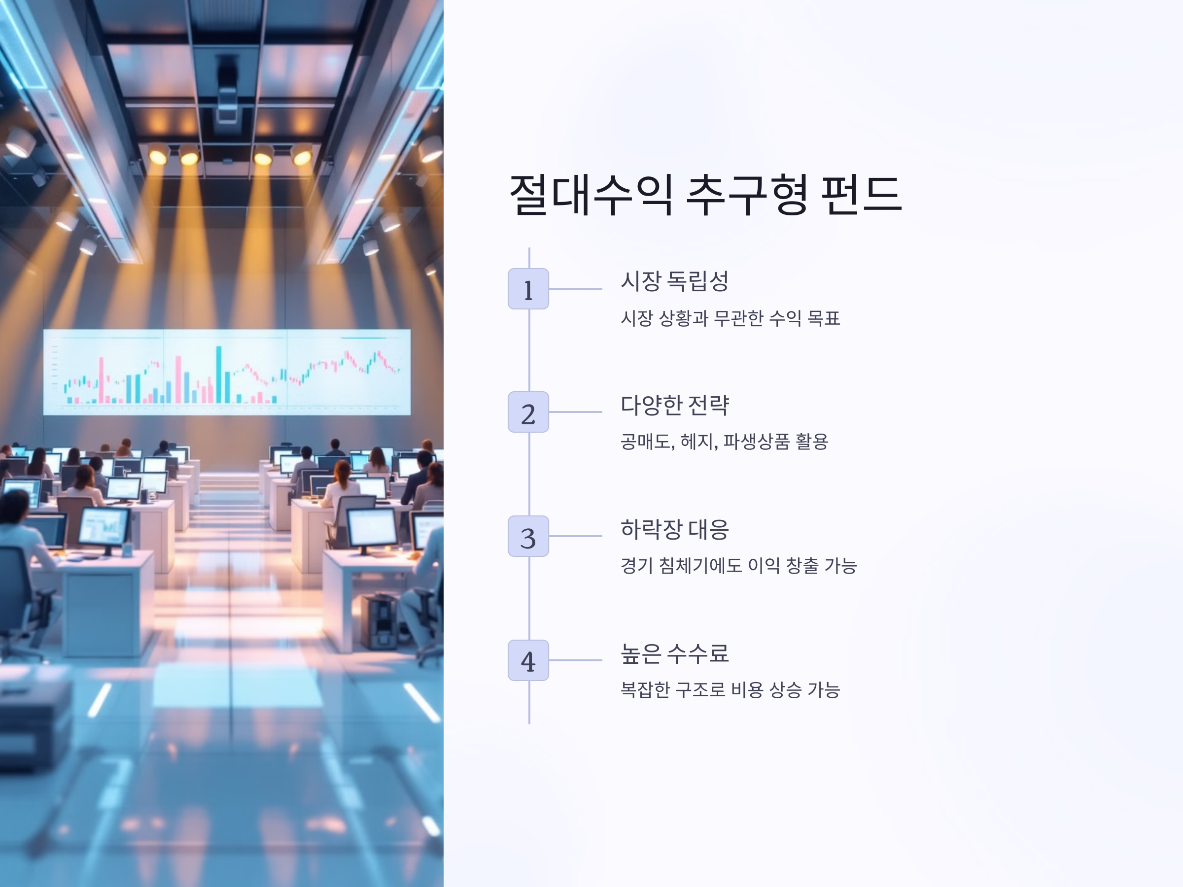절대수익 추구형 펀드는 시장 상황과 상관없이 일정 수준 이상의 수익을 목표로 하는 전략입니다. 공매도, 헤지, 파생상품 등을 활용해 하락장에서도 이익을 낼 수 있는 구조입니다. 글로벌 금융 위기나 경기 침체기에 빛을 발하는 전략으로, 리스크 관리와 분산 투자에 중점을 둡니다. 하지만 구조가 복잡하고 수수료가 높을 수 있어, 투자 전에 상품 설명서를 꼼꼼히 살펴보는 것이 중요합니다.
