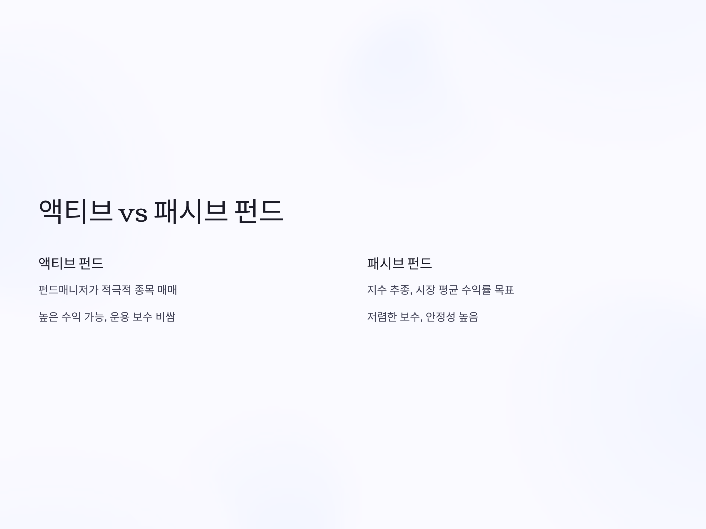 펀드 운용 전략의 대표적인 분류는 액티브 펀드와 패시브 펀드입니다. 액티브 펀드는 펀드매니저가 시장 수익률을 초과하는 것을 목표로 적극적으로 종목을 매매하는 전략입니다. 반면 패시브 펀드는 KOSPI200, S&P500 같은 지수를 그대로 따라가며 시장 평균 수익률을 추종합니다. 액티브 펀드는 높은 수익을 노릴 수 있지만 운용 보수가 비싸고, 시장 예측 실패 시 손실이 클 수 있습니다. 반대로 패시브 펀드는 저렴한 보수와 안정성이 장점이지만, 초과 수익은 기대하기 어렵습니다. 투자 성향에 따라 도전적이라면 액티브, 안정적이라면 패시브를 선택하는 것이 현명합니다.
