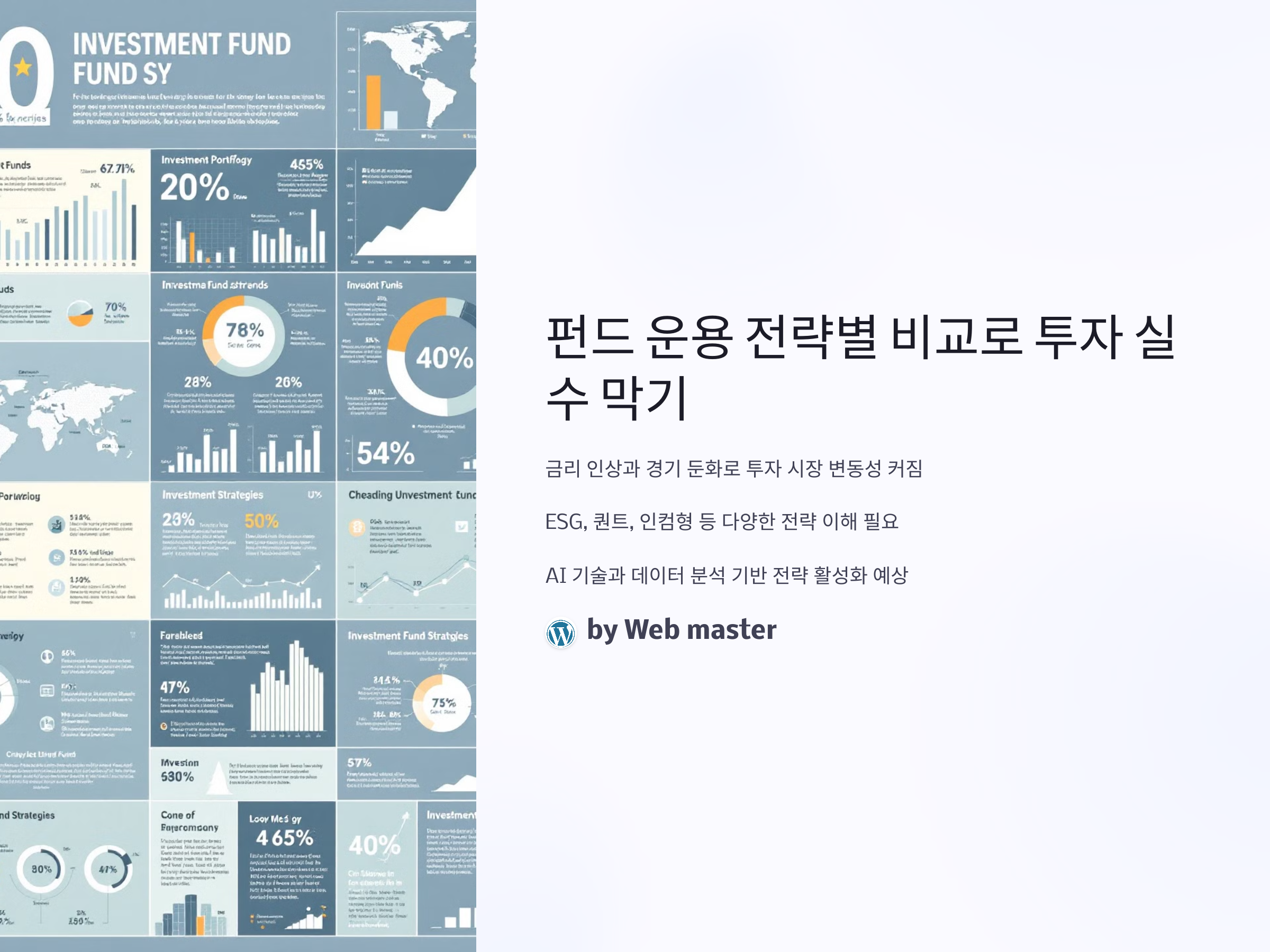 최근 금리 인상과 글로벌 경기 둔화로 인해 투자 시장의 변동성이 커지면서, 펀드 투자자들의 관심이 '운용 전략'에 집중되고 있습니다. 특히 2024년부터 ESG, 퀀트, 인컴형 펀드 등의 전략이 강화되면서, 투자자들은 단순히 수익률이 아닌 전략의 특성을 이해하고 선택해야 하는 상황입니다. 실제로 자산운용사들은 기존 주식형, 채권형에서 벗어나 절대수익 추구형, 멀티에셋형 등으로 상품을 다각화하고 있으며, 이로 인해 펀드 포트폴리오를 재구성하는 개인 투자자들이 급증하고 있습니다. 향후 AI 기술 접목과 데이터 분석 기반의 스마트 베타 전략이 활성화될 것으로 예상되며, 이에 따른 펀드 운용 전략별 비교와 이해는 더 이상 선택이 아닌 필수가 되었습니다. 오늘은 각 운용 전략의 차이점, 장단점, 투자 팁을 통해 현명한 펀드 투자의 길을 안내합니다.