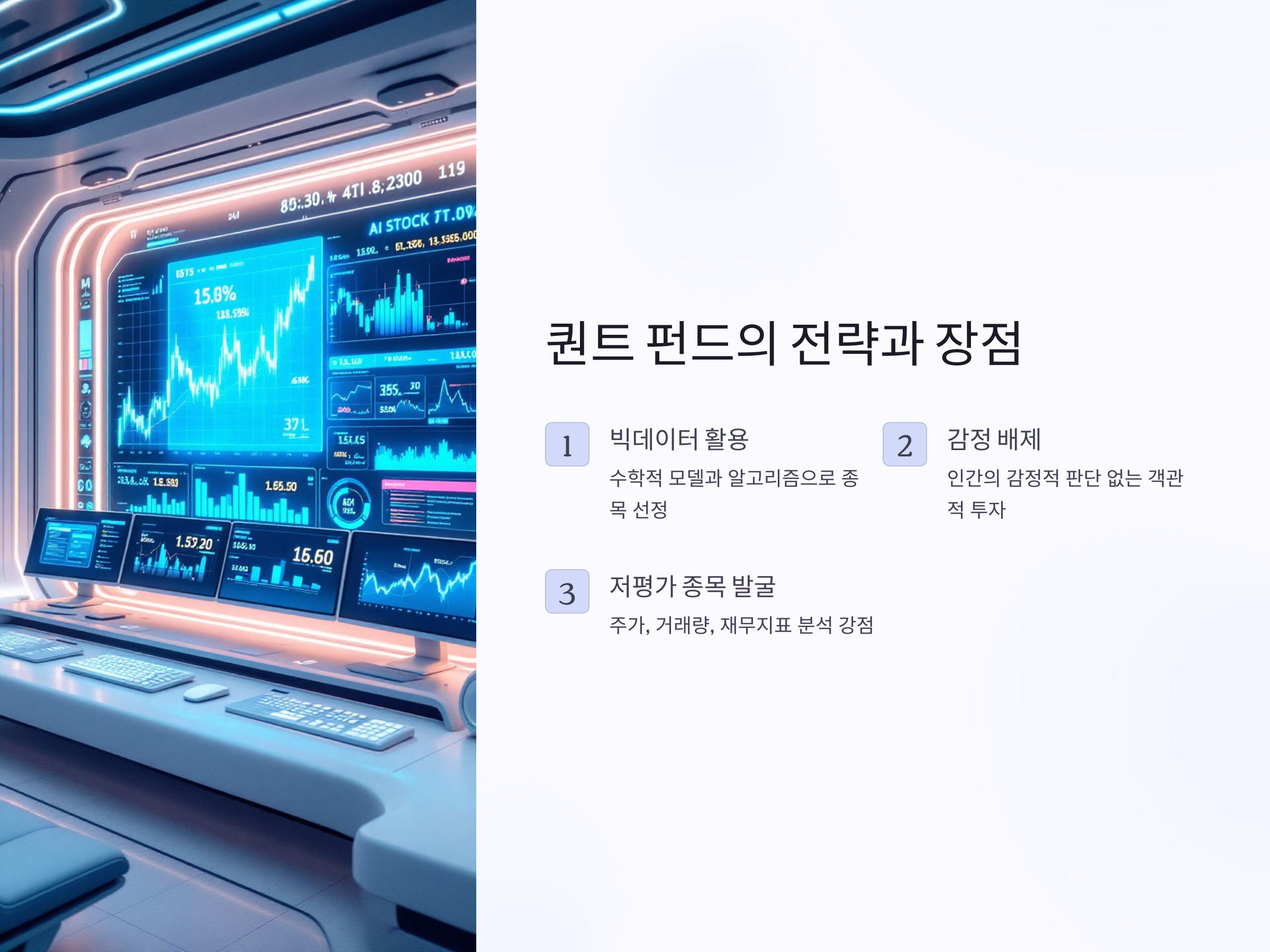 퀀트 펀드는 빅데이터와 인공지능을 활용해 투자 전략을 자동으로 운용하는 펀드입니다. 수학적 모델과 알고리즘을 통해 종목을 선정하고 비중을 조절하기 때문에 인간의 감정적 판단을 배제할 수 있습니다. 특히 주가, 거래량, 재무 지표 등을 분석해 저평가 종목을 찾는 데 강점을 보입니다. 최근 금융 시장에서도 퀀트 펀드의 성장세가 눈에 띄며, 장기적 관점에서 안정적인 수익률을 기대할 수 있는 전략으로 자리 잡고 있습니다. 다만, 급격한 시장 변동성에는 예측력이 떨어질 수 있어 주의가 필요합니다.