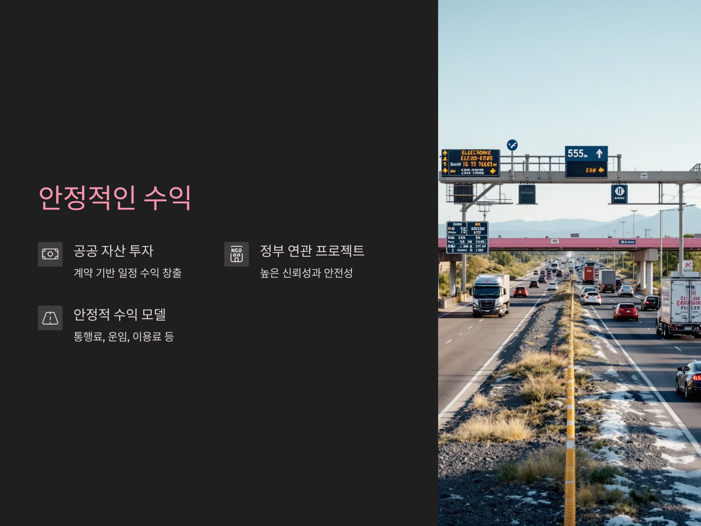 인프라 펀드는 공공적인 성격을 가진 자산에 투자하는 형태입니다. 이러한 자산들은 대부분 계약을 통해 일정한 수익을 창출하기 때문에 경제의 전반적인 상황에 관계없이 꾸준한 현금 흐름을 유지할 수 있습니다. 특히, 정부가 연관된 프로젝트인 경우, 신뢰성과 수익성 측면에서 안전성이 더욱 높습니다. 예를 들어, 도로 통행료, 철도 운임, 공항 이용료와 같은 수익 모델은 장기적으로 안정적인 수익을 제공합니다.