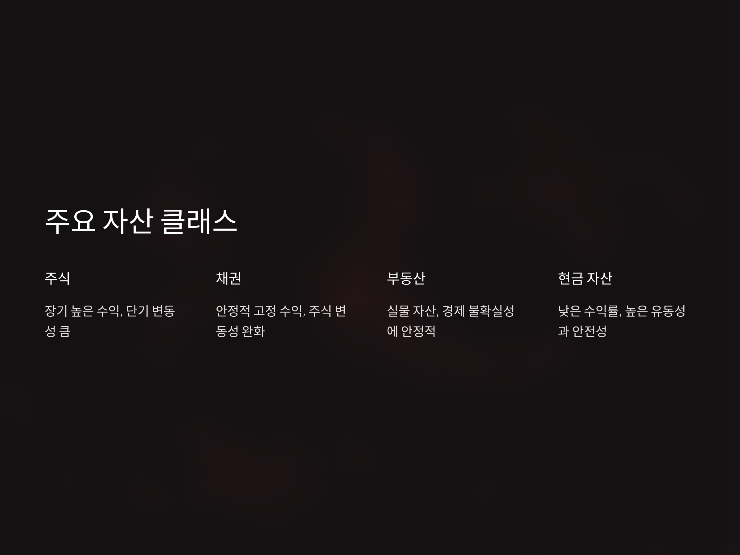 자산 배분에서 고려할 주요 자산 클래스는 크게 4가지로 나눌 수 있습니다: 주식, 채권, 부동산, 현금 자산입니다. 각 자산 클래스의 특징을 살펴보면 다음과 같습니다.
