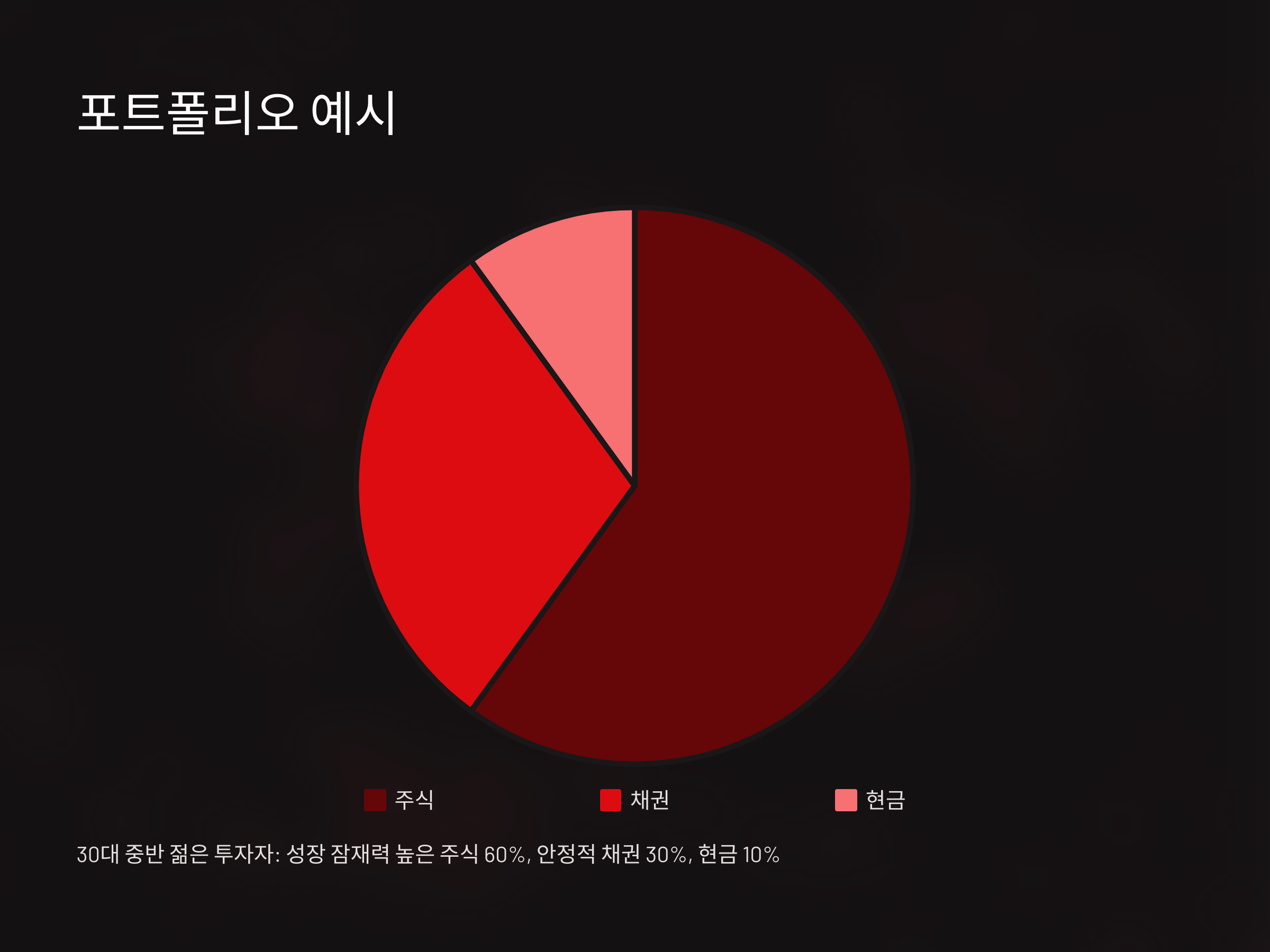 자산 배분 포트폴리오는 투자자의 목표와 리스크 수용 능력에 따라 다를 수 있습니다. 예를 들어, 30대 중반의 젊은 투자자는 높은 성장 잠재력을 가진 주식에 60%의 비중을 두고, 안정적인 수익을 제공하는 채권에 30%, 현금 자산에 10%를 배분할 수 있습니다. 반면, 은퇴를 앞둔 투자자는 안정성을 고려하여 채권 비중을 높이고, 주식은 30%, 채권은 50%, 현금 자산은 20% 정도로 설정할 수 있습니다.
