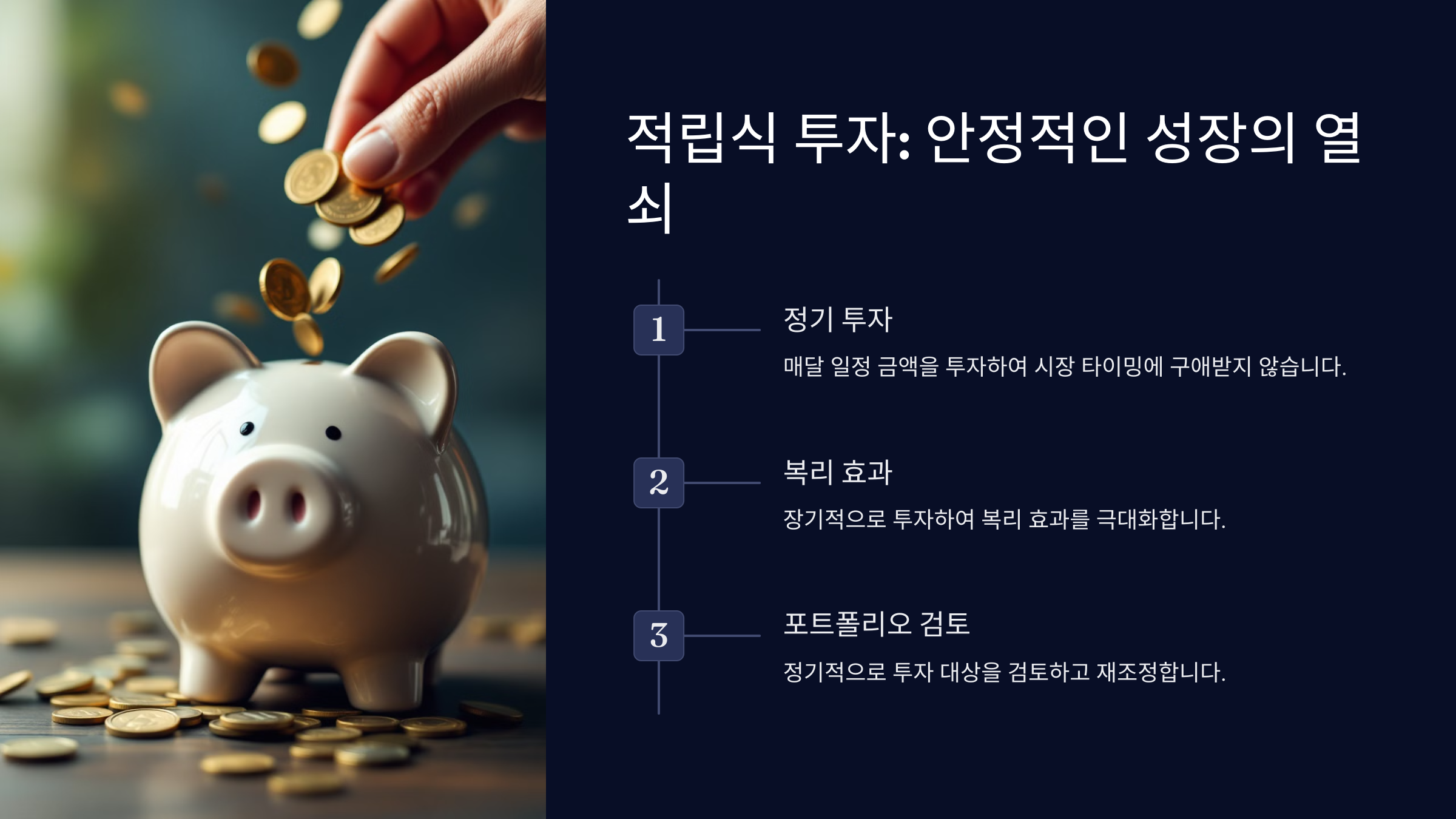 - 장점: 시장 타이밍에 구애받지 않음, 복리 효과 극대화.