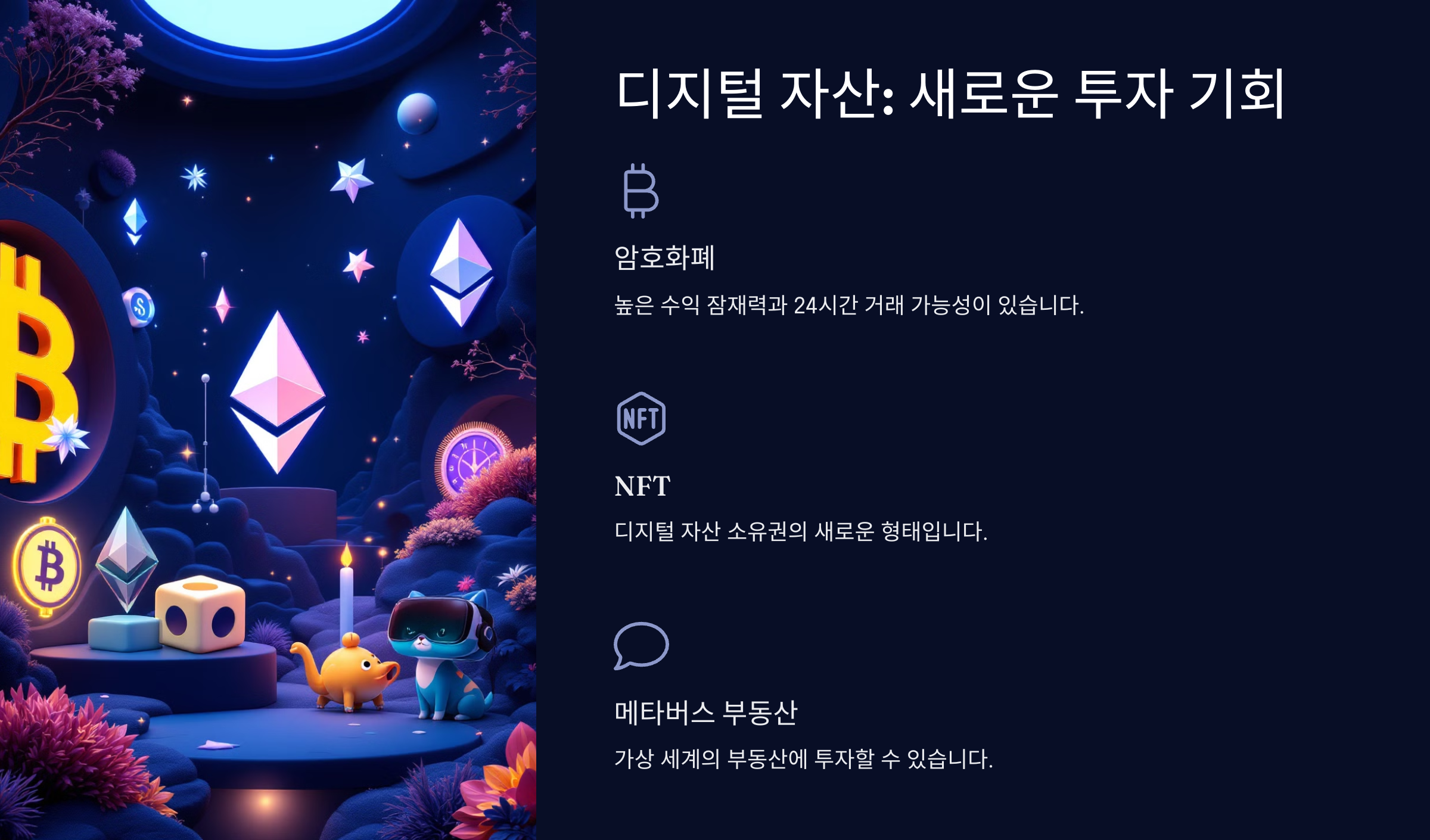 암호화폐, NFT, 메타버스 부동산 등 디지털 자산은 최근 몇 년간 폭발적인 성장을 기록하며 새로운 자산 증식 방법으로 자리 잡았습니다.