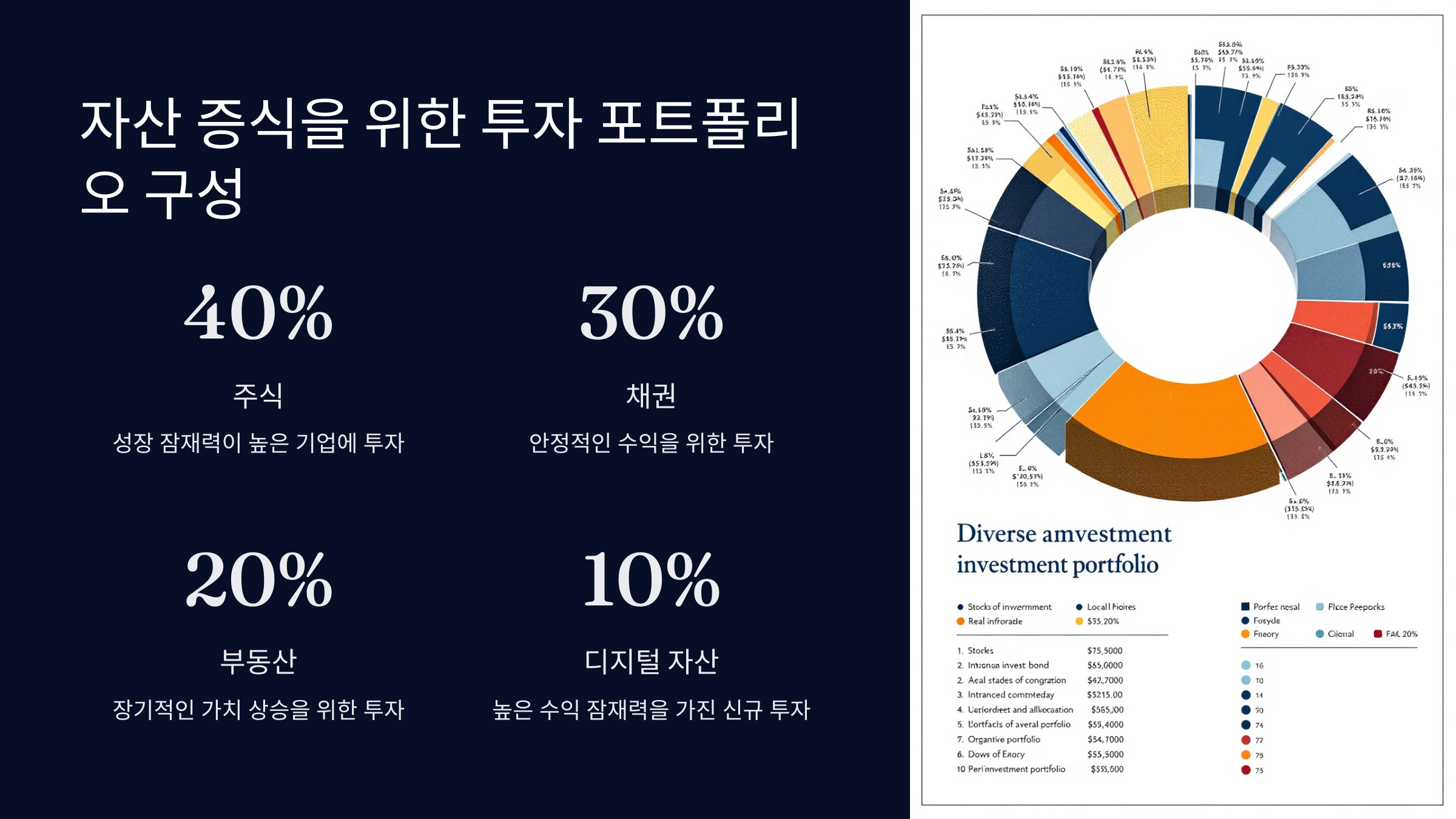 - 위험 분산: 모든 자산을 한 곳에 투자하지 마세요. 주식, 채권, 부동산, 예금 등으로 분산 투자하면 리스크를 줄일 수 있습니다.