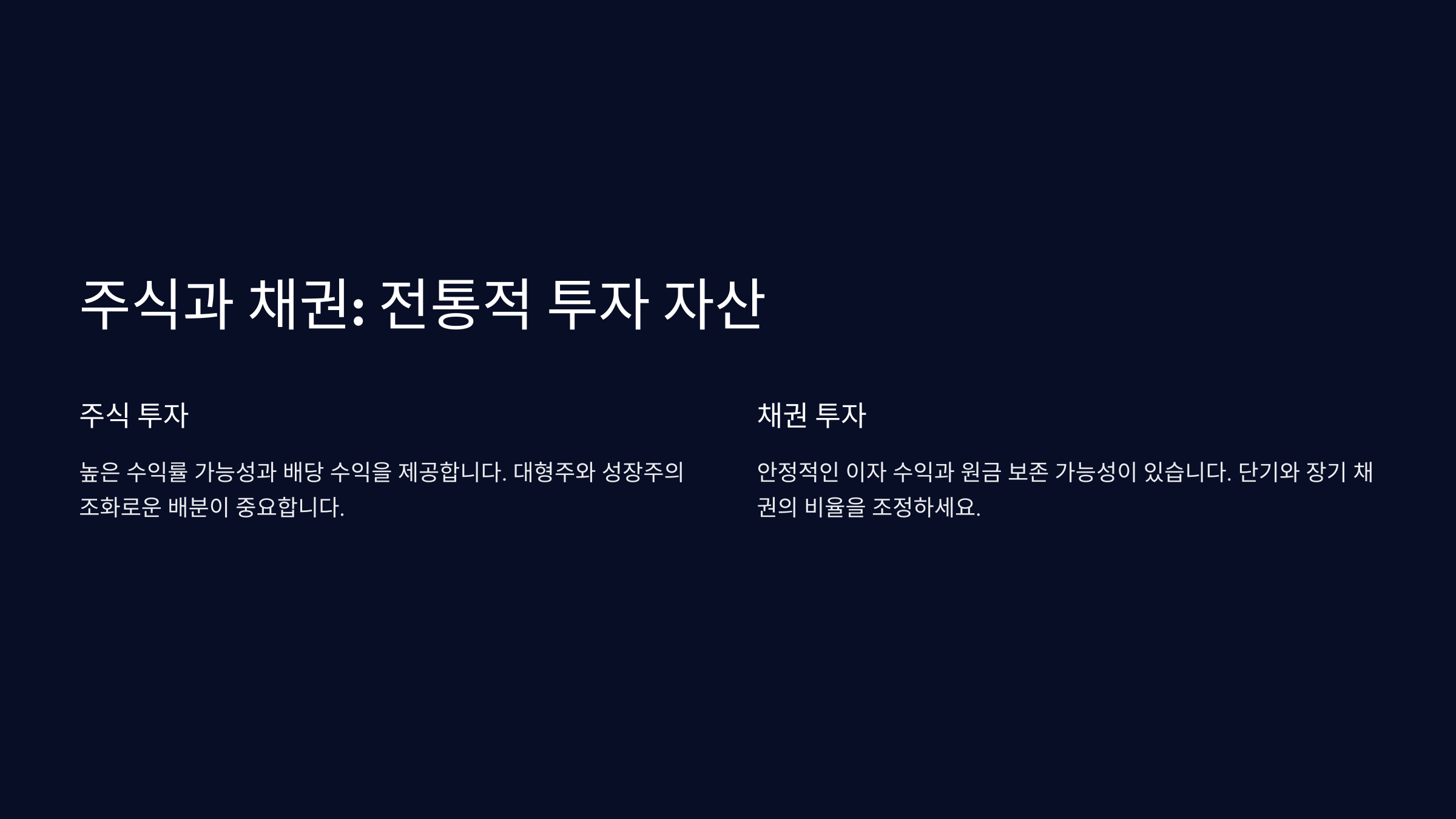 주식과 채권은 자산 증식의 전통적인 도구로, 초보자도 쉽게 접근할 수 있는 투자 수단입니다. 올바른 방법으로 투자하면 장기적인 성장을 기대할 수 있습니다.