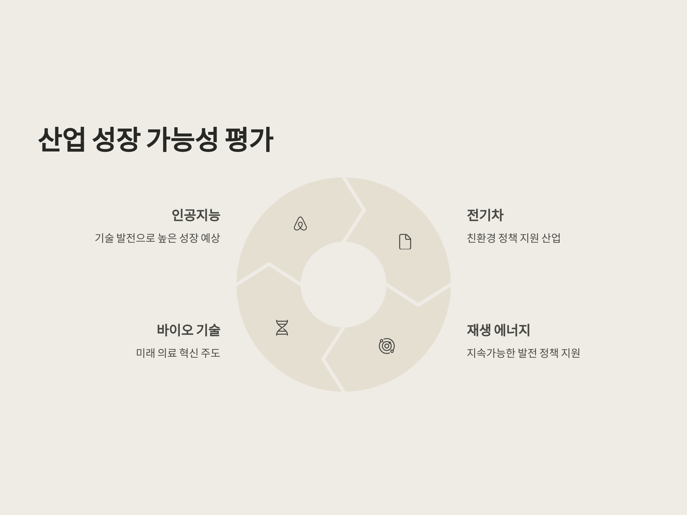 따라서 산업 성장 가능성을 평가할 때는 시장의 트렌드와 미래 전망을 고려해야 합니다. 또한, 각 산업의 정부 정책이나 글로벌 경제 흐름도 중요한 영향을 미칠 수 있습니다. 해당 산업이 지속 가능한 발전을 이루기 위한 정책적 지원을 받고 있는지도 체크해야 합니다.