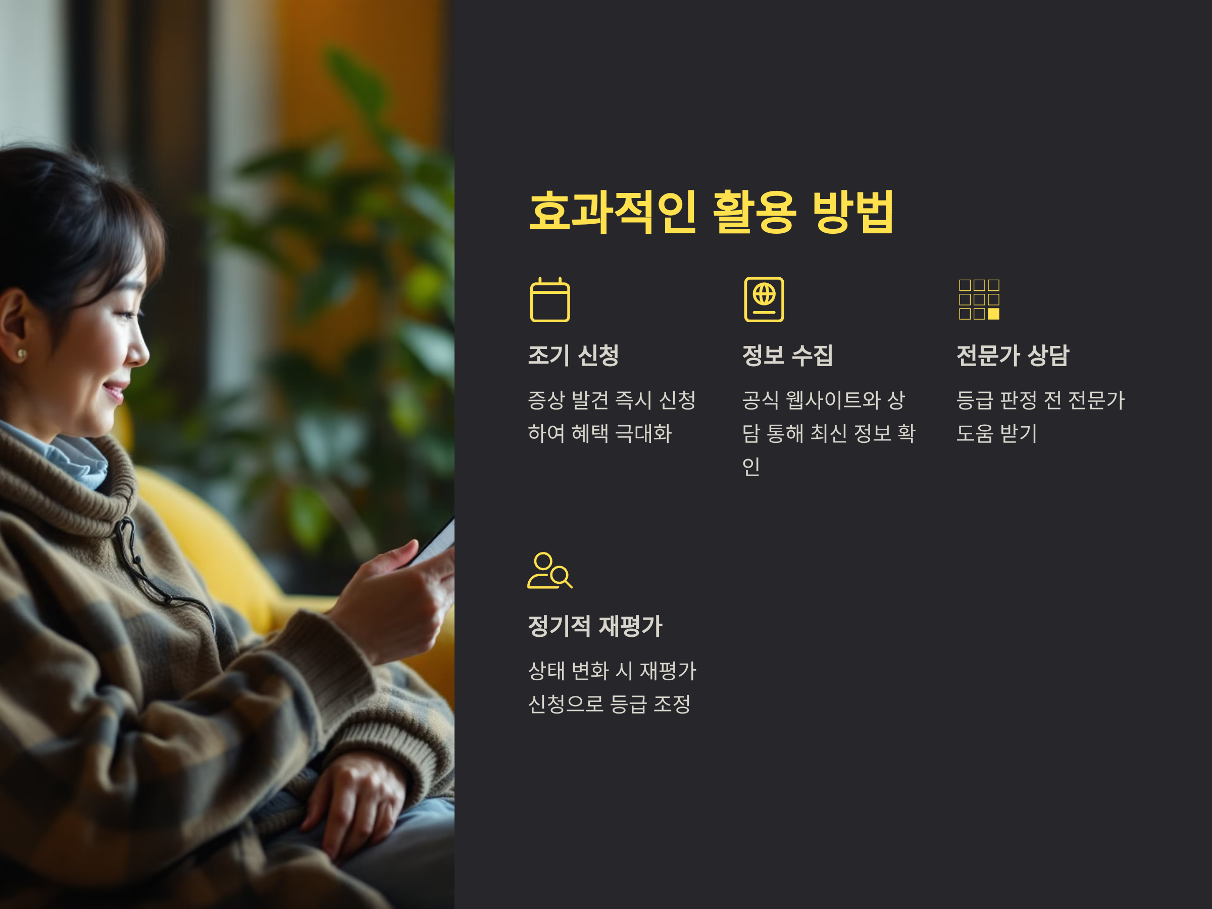 장기 요양 보험 혜택을 받으려면 등급 판정이 꼭 필요합니다. 등급은 1등급부터 5등급, 그리고 인지지원등급까지 총 6단계로 나뉩니다. 등급은 공단 직원이 신청자의 건강상태, 생활 능력 등을 직접 방문 조사한 후 결정되며, 등급에 따라 지원받을 수 있는 서비스의 범위와 비용이 달라집니다. 특히 2024년부터는 인지 기능 저하를 겪고 있는 경증 치매 환자를 위한 인지지원등급 혜택이 확대되어 더 많은 분들이 서비스를 받을 수 있게 되었습니다. 이 등급 기준이 까다롭다고 느껴질 수 있지만, 전문가의 도움을 받으면 신청부터 판정까지 수월하게 진행할 수 있습니다.
