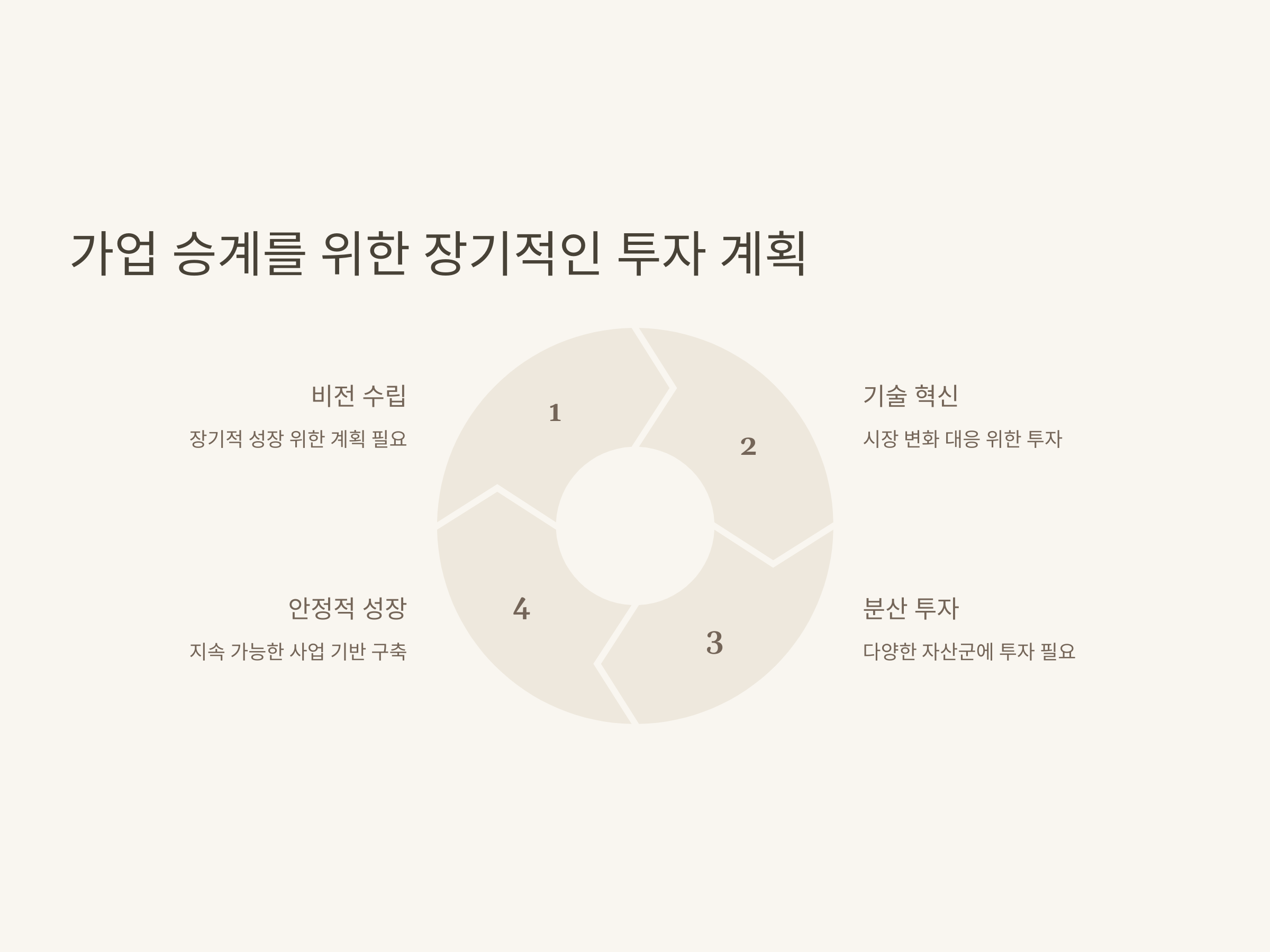장기적인 투자는 기업의 미래 성장 가능성을 높이고, 가업 승계자가 사업을 안정적으로 이어갈 수 있게 해줍니다. 또한, 사업 외의 투자도 고려해야 하며, 다양한 자산군에 대한 분산 투자 전략을 세울 필요가 있습니다.