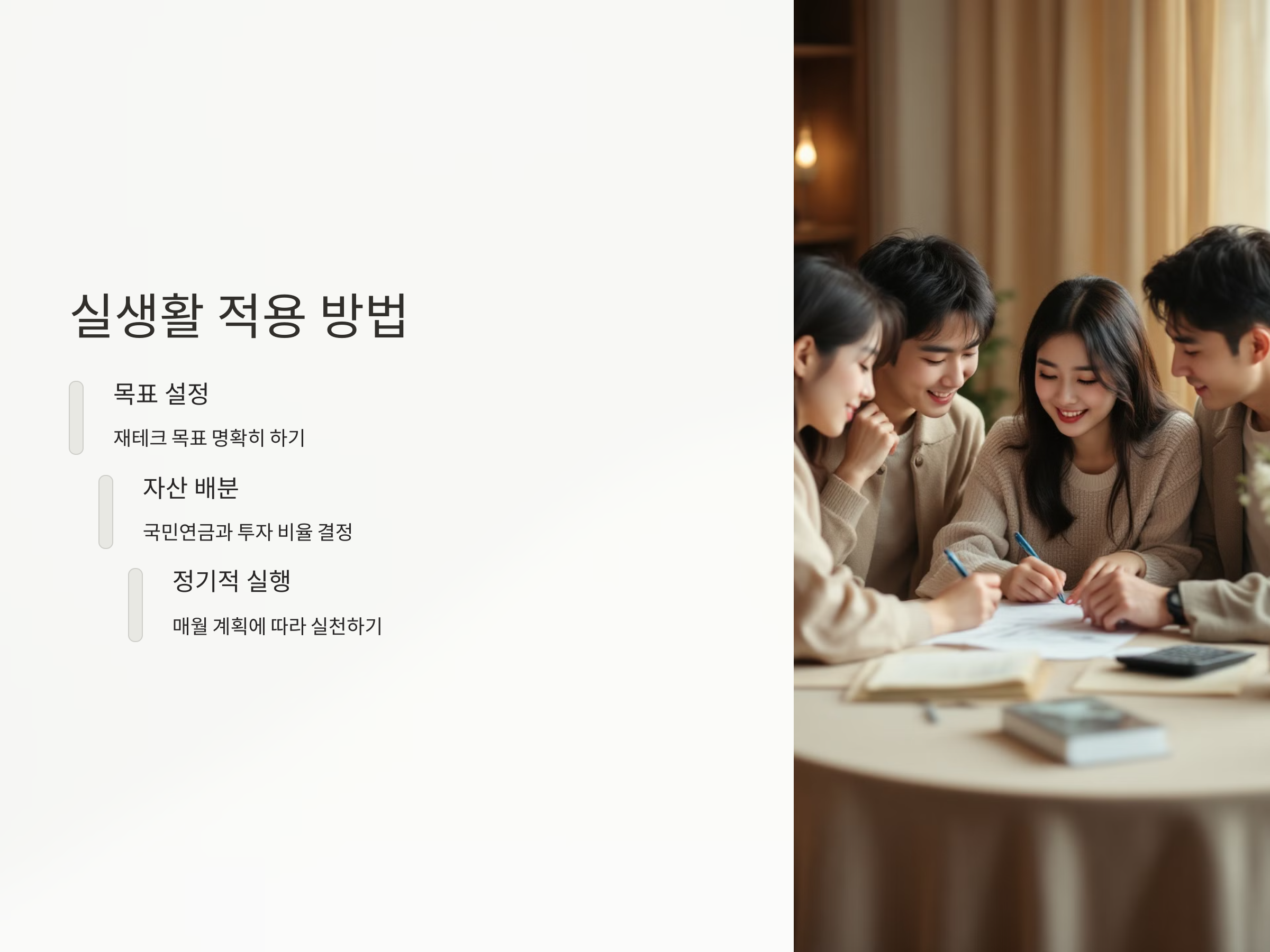 실제 적용 방법으로는 먼저 재테크의 목표를 설정한 후, 이를 기반으로 국민연금과 자산 배분 전략을 짜는 것입니다. 예를 들어, 매달 일정 금액을 국민연금에 추가로 납부하면서, 동시에 다양한 투자처에 분산 투자하여 자산을 키우는 전략을 세울 수 있습니다.