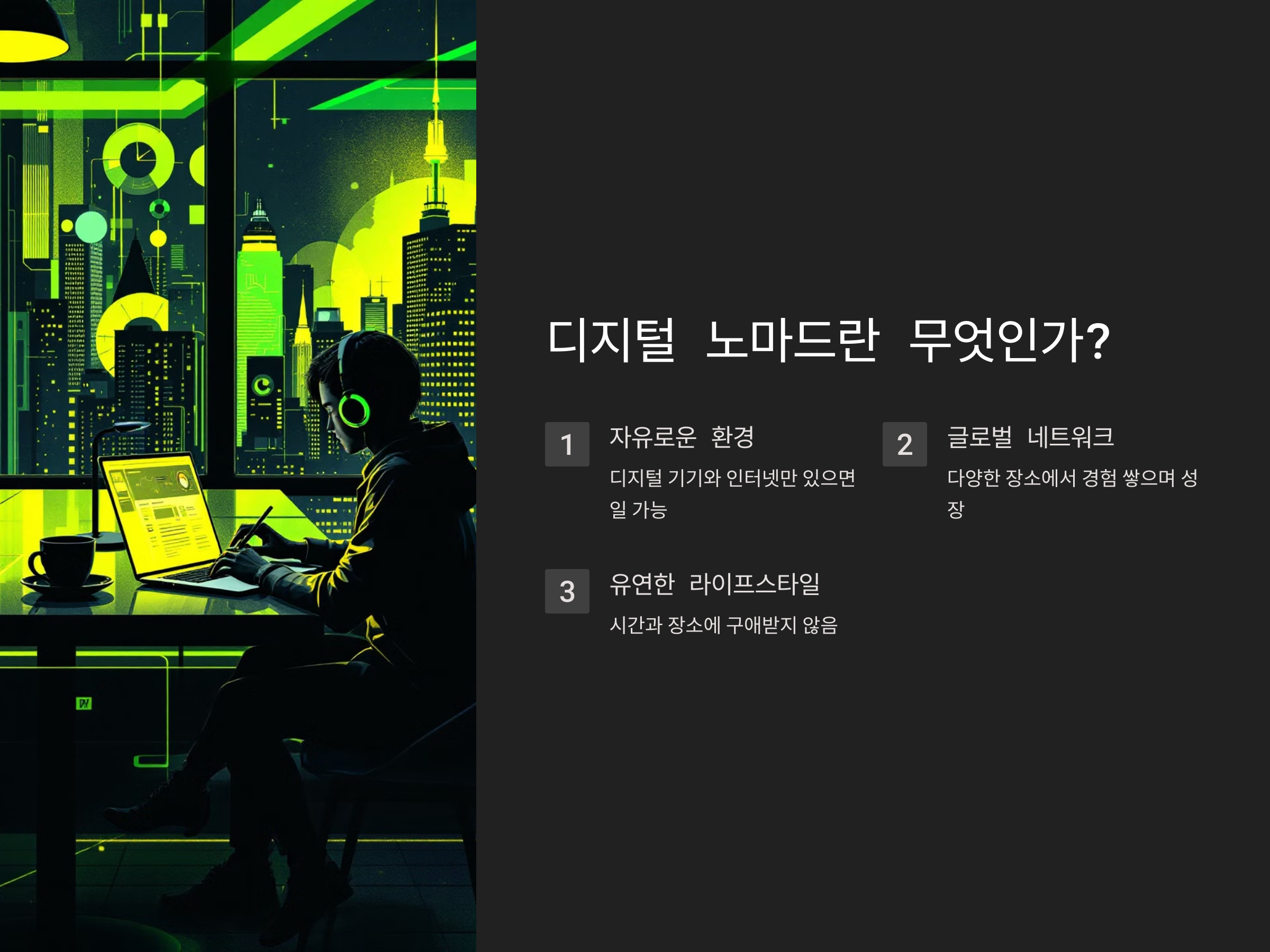 디지털 노마드는 더 이상 단순히 '어디서든 일을 한다'는 개념을 넘어서, 글로벌한 네트워크와 기회를 활용하여 자신의 커리어를 관리하고, 다양한 장소에서 경험을 쌓아가며 성장하는 방식으로 발전하고 있습니다. 이러한 변화는 단지 기술적인 혁신만이 아니라, 삶의 방식을 근본적으로 변화시키고 있는 중요한 현상입니다.