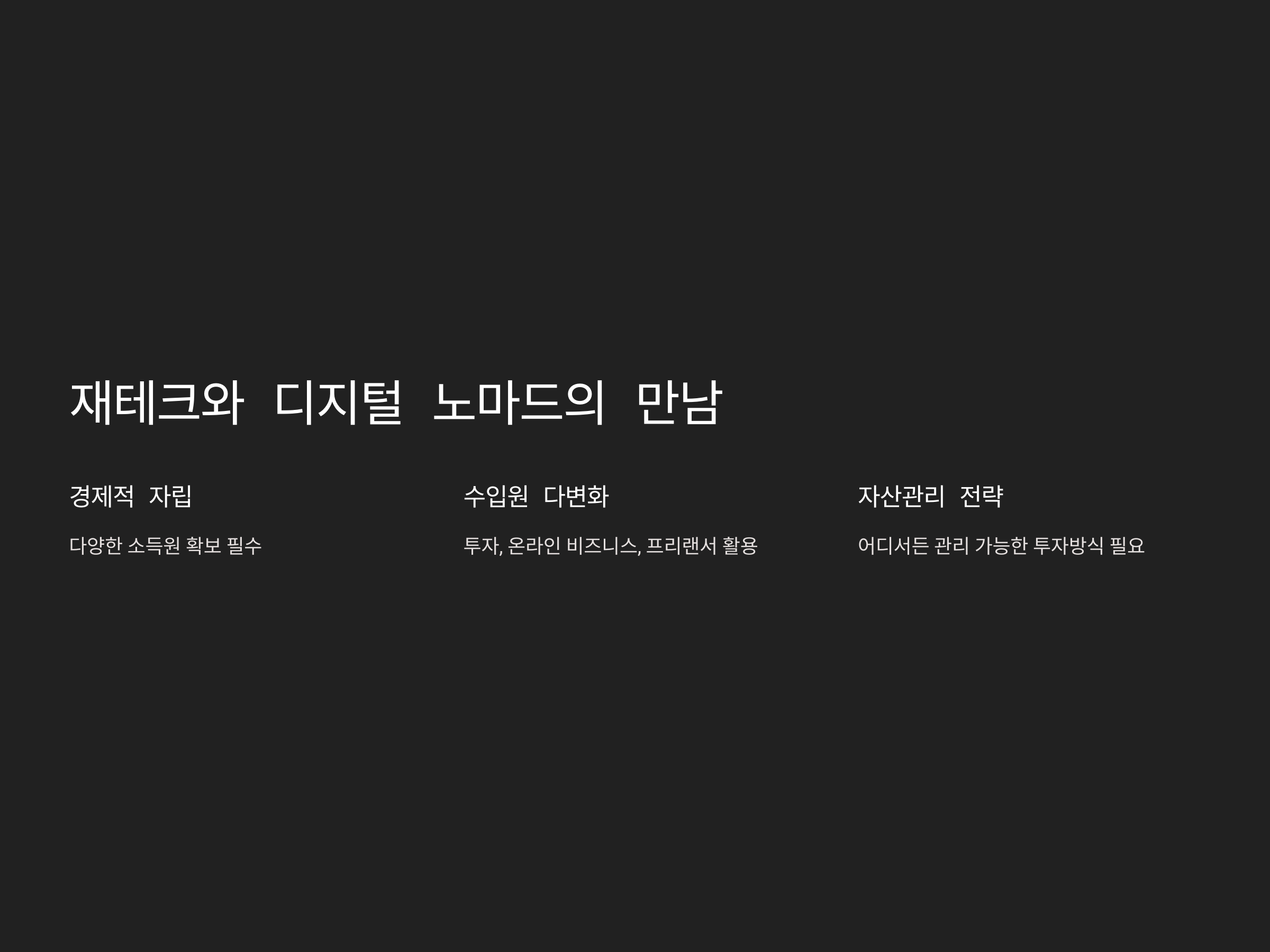 디지털 노마드는 이제 여행과 자유로운 삶을 꿈꾸는 사람들에게만 해당되는 것이 아니라, 자신만의 직장, 라이프스타일을 찾고자 하는 많은 사람들이 선택하는 방식으로 자리잡고 있습니다. 이와 동시에 재테크 역시 변화하고 있습니다. 왜냐하면 재테크는 이제 한 곳에 정착해 돈을 벌고, 그 돈을 모아두는 방식에서 벗어나 점점 더 다양한 방식으로 돈을 불리는 시대가 되었기 때문입니다. 이제는 디지털 기술을 활용하여 언제 어디서나 재테크를 할 수 있는 시대가 되었습니다.
