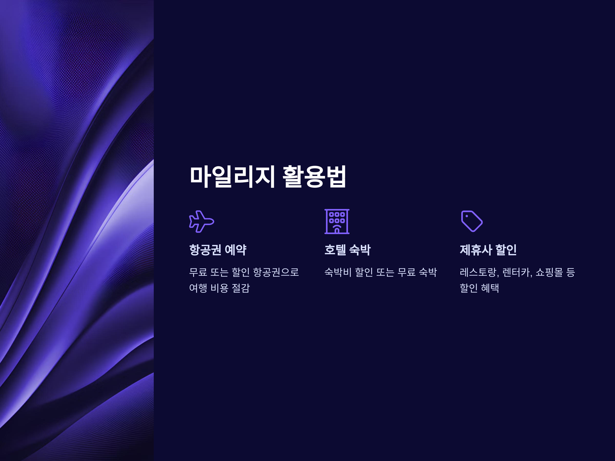 - 항공사 마일리지: 주로 비행기를 자주 타는 사람들에게 유리하며, 국제선 및 국내선에서 항공권 구매 시 적립됩니다.