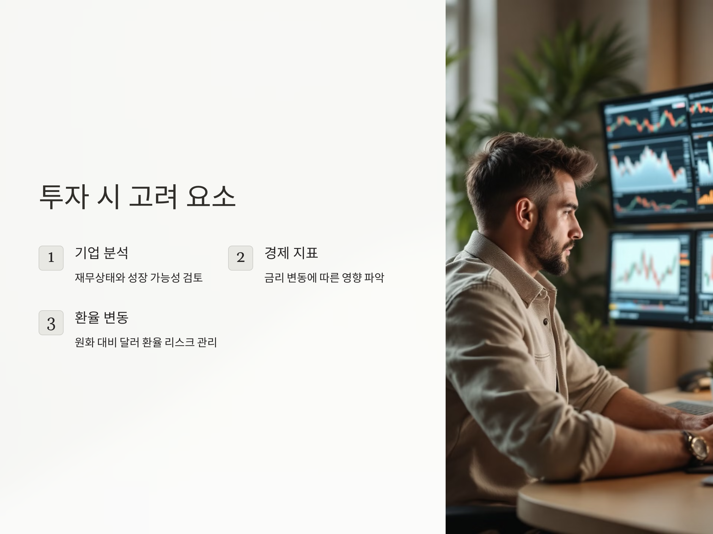 미국 주식에 투자할 때 고려해야 할 중요한 요소들이 있습니다. 첫 번째로, 기업의 재무 상태와 성장 가능성을 꼼꼼히 분석하는 것이 필요합니다. 예를 들어, 기술주 투자 시에는 기업의 연구개발(R&D) 투자 비율과 향후 기술 혁신 가능성을 살펴보는 것이 중요합니다.