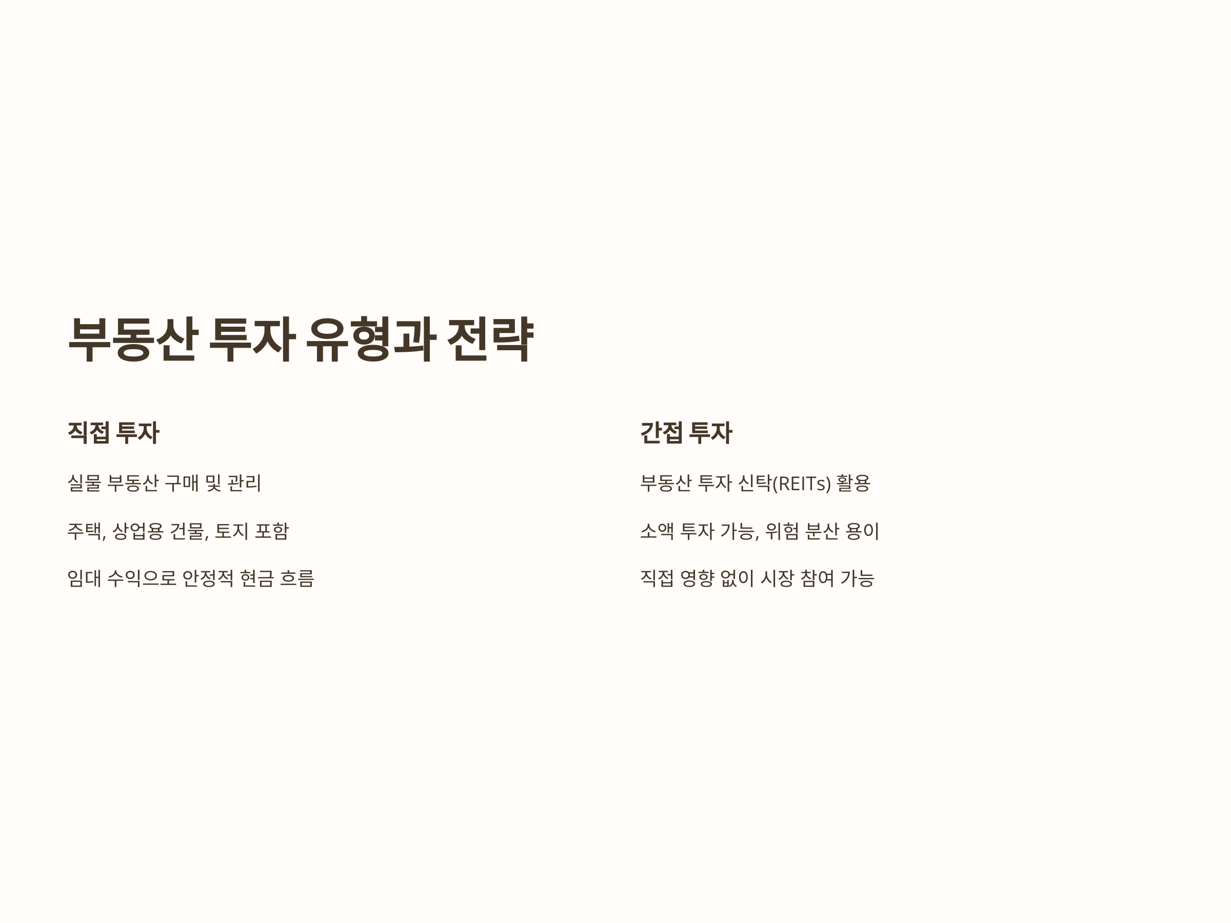 직접 투자는 실물 부동산을 구매하고 이를 직접 관리하는 방법입니다. 주택, 상업용 건물, 토지 등 다양한 형태의 부동산이 이에 포함됩니다. 직접 투자는 관리와 운영이 필요한 만큼 시간과 노력이 소요되지만, 자산 가치를 직접 증대시킬 수 있는 장점이 있습니다. 또한, 임대 수익을 통해 안정적인 현금 흐름을 만들 수 있는 가능성이 큽니다.