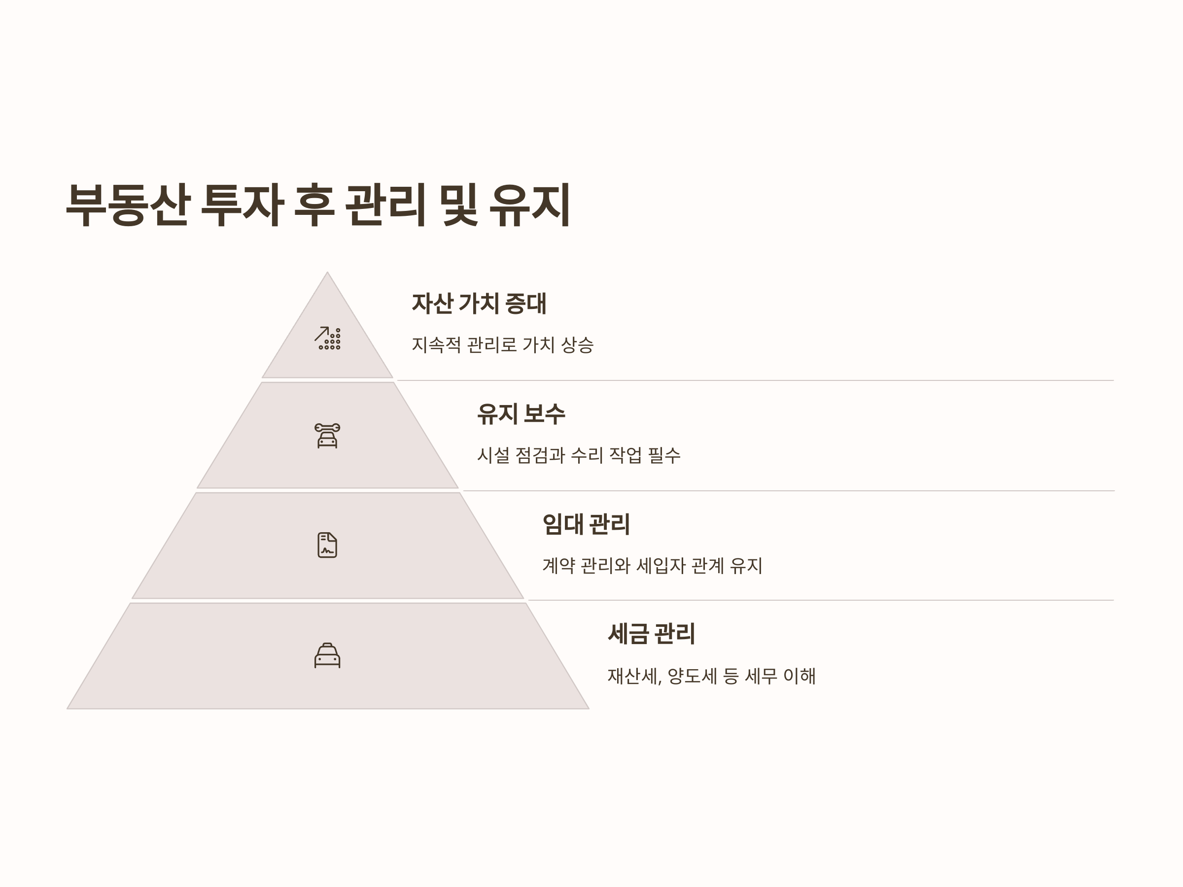 부동산을 구입한 후에는 효과적인 관리가 중요합니다. 투자한 부동산의 가치를 꾸준히 유지하거나 상승시킬 수 있는 방법을 마련해야 합니다. 관리에 있어 중요한 요소는 다음과 같습니다.