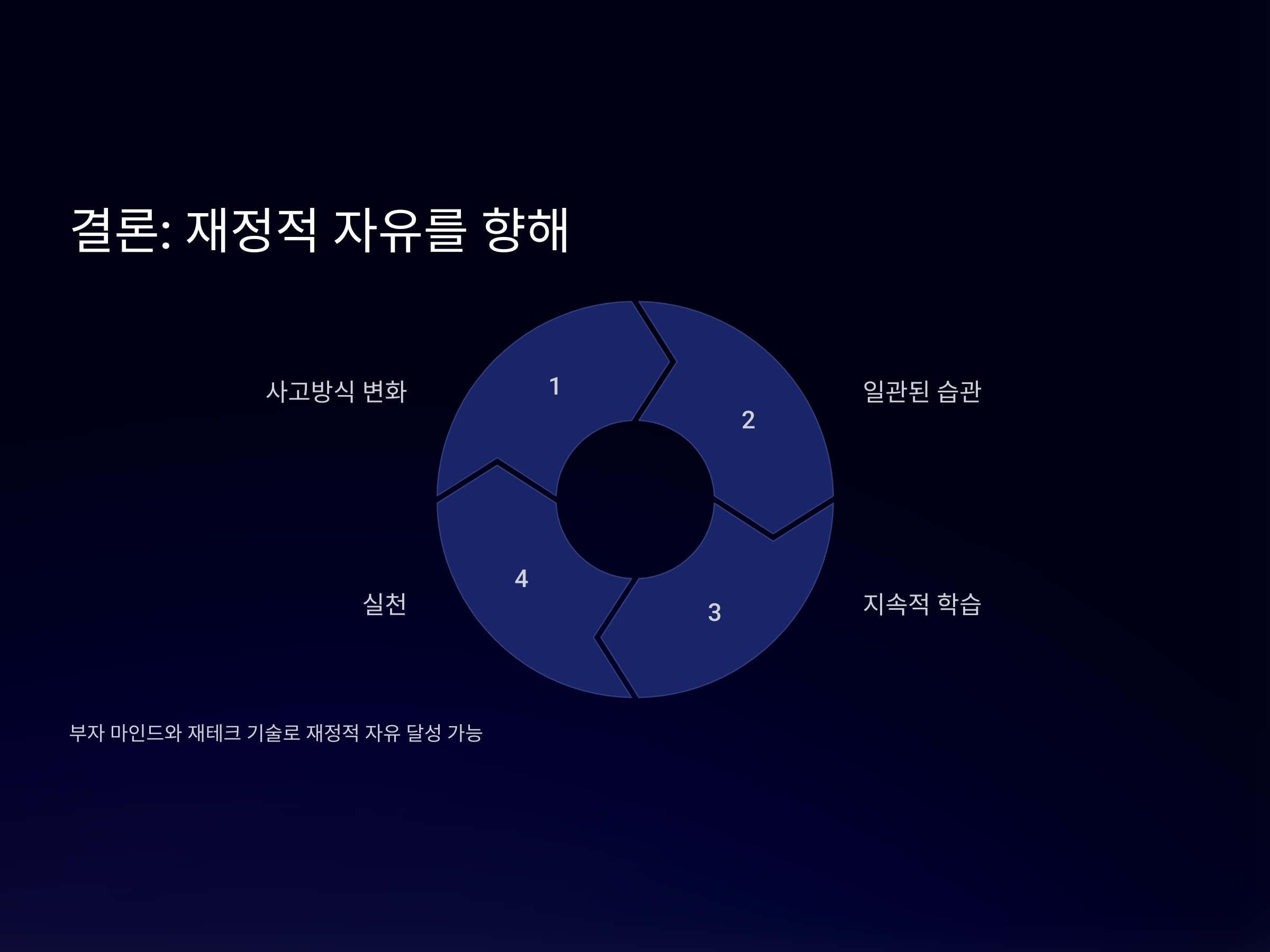 부자 마인드와 재테크는 단순한 기술적 접근이 아닌, 사고방식과 일관된 습관에서 비롯됩니다. 부자들이 가진 사고방식을 배우고, 이를 실천에 옮기면서 꾸준히 자산을 키워 나가면, 누구든지 재정적 자유를 얻을 수 있을 것입니다. 오늘부터 작은 변화로 시작해보세요.
