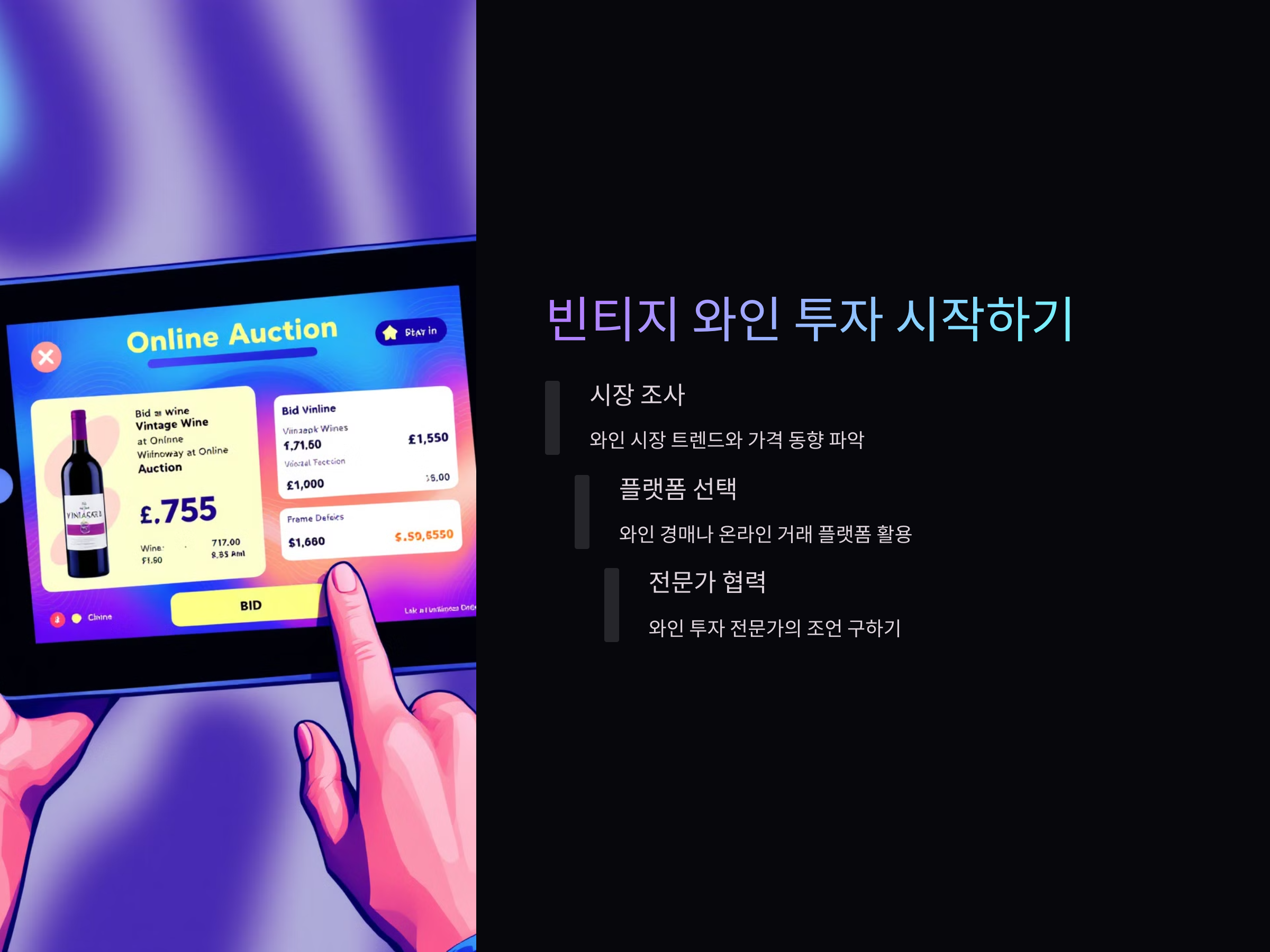빈티지 와인 투자를 시작하는 데에는 몇 가지 방법이 있습니다. 첫 번째로, 와인 경매나 온라인 와인 거래 플랫폼을 활용하는 것입니다. 많은 경매 사이트에서는 빈티지 와인 경매를 진행하며, 이곳에서 자신의 예산에 맞는 와인을 구매할 수 있습니다. 또한, 일부 온라인 플랫폼에서는 와인 거래를 위한 다양한 서비스도 제공하고 있으므로, 이를 통해 안전하고 효율적으로 투자를 시작할 수 있습니다.