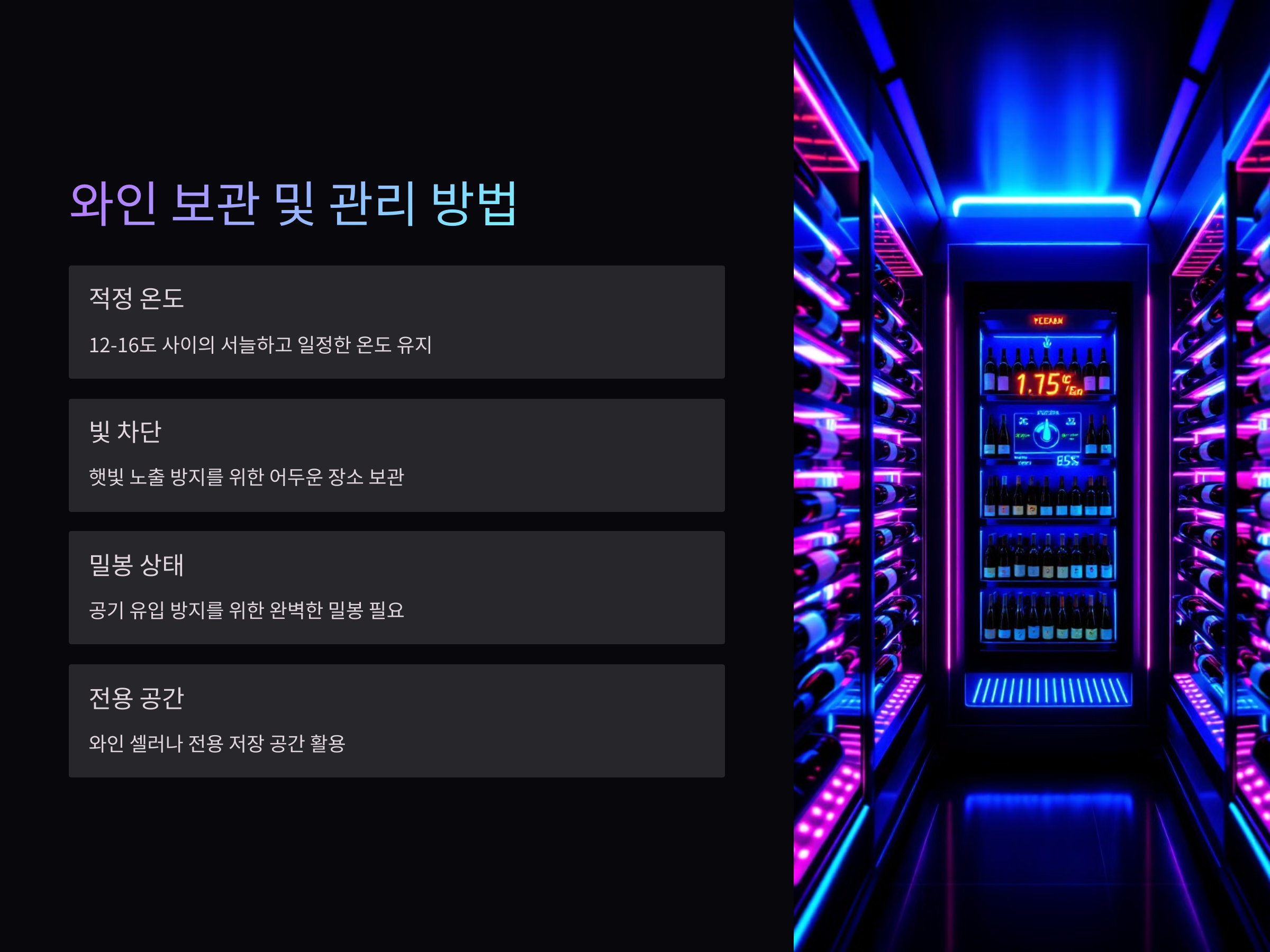 빈티지 와인을 구매했다면, 이제 중요한 것은 보관입니다. 와인의 품질을 유지하려면 적절한 보관 조건이 필수적입니다. 일반적으로 와인은 서늘하고 일정한 온도에서 보관하는 것이 좋습니다. 12도에서 16도 사이의 온도가 적당하며, 너무 뜨겁거나 추운 온도에서는 와인의 품질이 떨어질 수 있습니다.