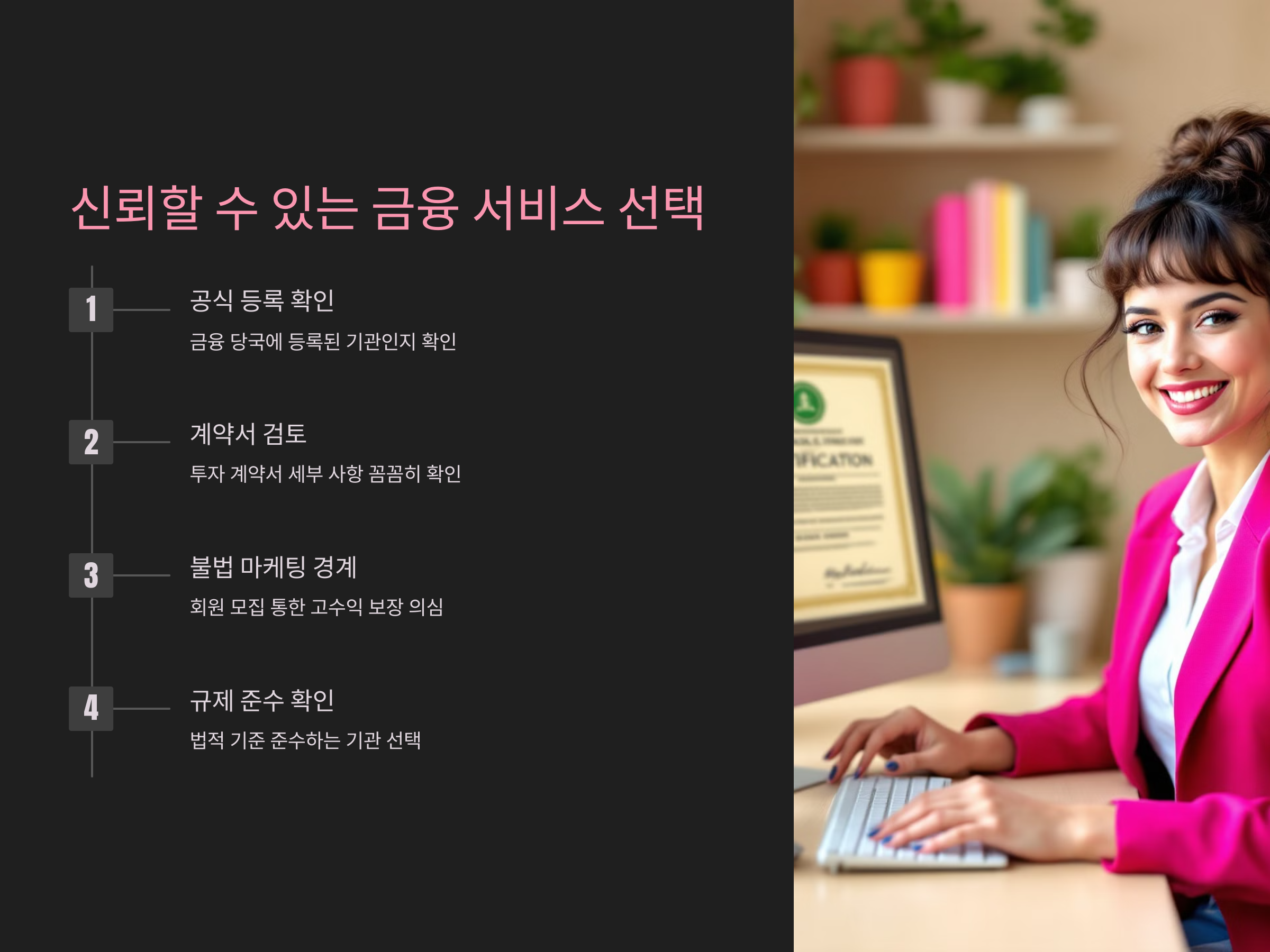 사기를 예방하는 가장 중요한 방법 중 하나는 신뢰할 수 있는 금융 서비스를 선택하는 것입니다. 은행, 증권사, 자산관리 회사 등은 금융 당국의 규제를 받는 기관들입니다. 이런 기관들은 법적 기준을 준수하며 투자자들의 자산을 보호하는 역할을 합니다. 하지만 모든 금융 서비스가 신뢰할 수 있는 것은 아니므로, 신뢰할 수 있는 금융 서비스인지 꼼꼼히 체크하는 것이 필수적입니다.