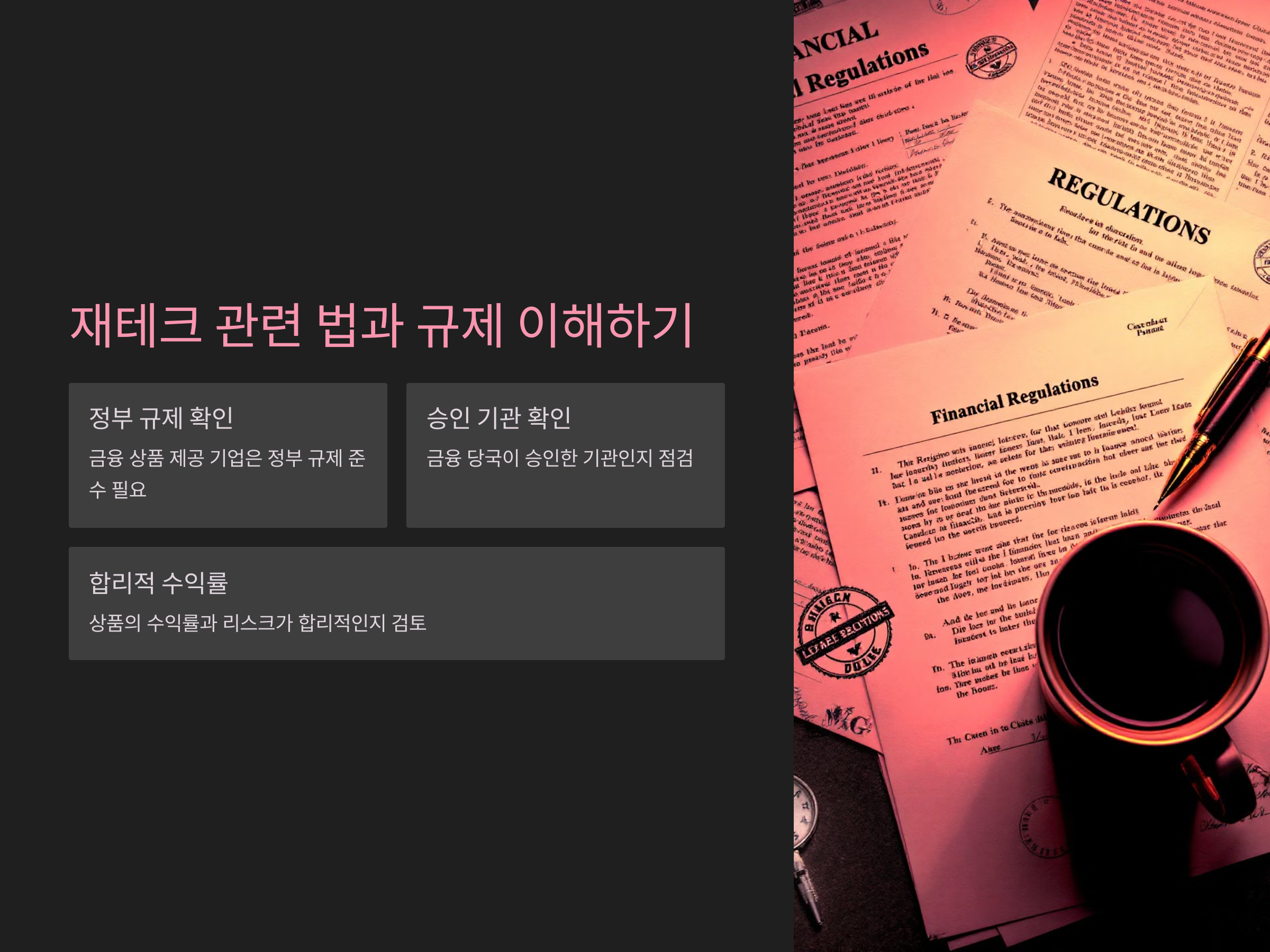 재테크에 있어 사기를 방지하려면 관련 법과 규제를 정확히 이해하는 것이 중요합니다. 금융 상품을 제공하는 기업들은 정부의 규제를 따라야 하며, 사기성 투자 상품을 제공하는 경우 법적인 처벌을 받을 수 있습니다. 정부는 금융 사기 방지를 위해 여러 법적 장치를 마련하고 있으며, 이를 통해 투자자들이 보다 안전하게 투자할 수 있도록 도와주고 있습니다.