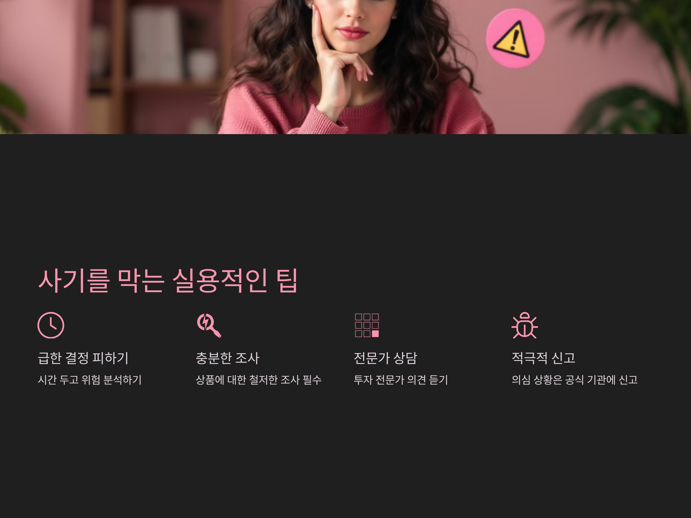 둘째, 투자하기 전에 반드시 상품에 대한 충분한 조사와 전문가의 상담을 받으세요. 투자 전문가나 경험이 풍부한 사람들의 의견을 듣고, 사기를 방지하는 방법에 대해 배우는 것이 중요합니다. 셋째, 의심이 가는 상황에서는 적극적으로 신고하고, 공식적인 기관을 통해 해결책을 모색해야 합니다. 정부나 금융 당국은 사기 피해를 예방하기 위해 다양한 신고 및 해결 절차를 제공하고 있습니다.