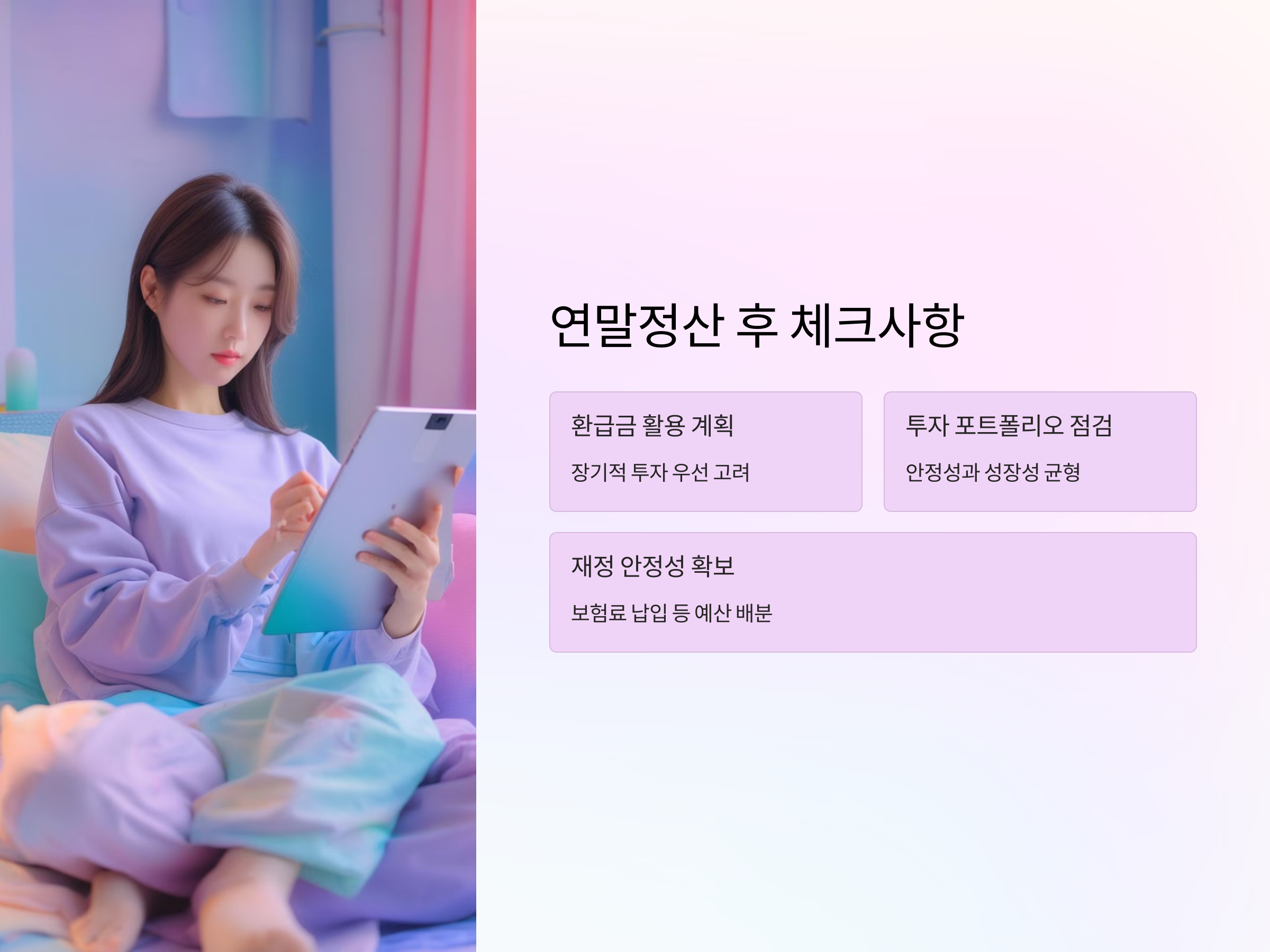- 환급받은 돈은 장기적인 재테크 투자에 활용한다.