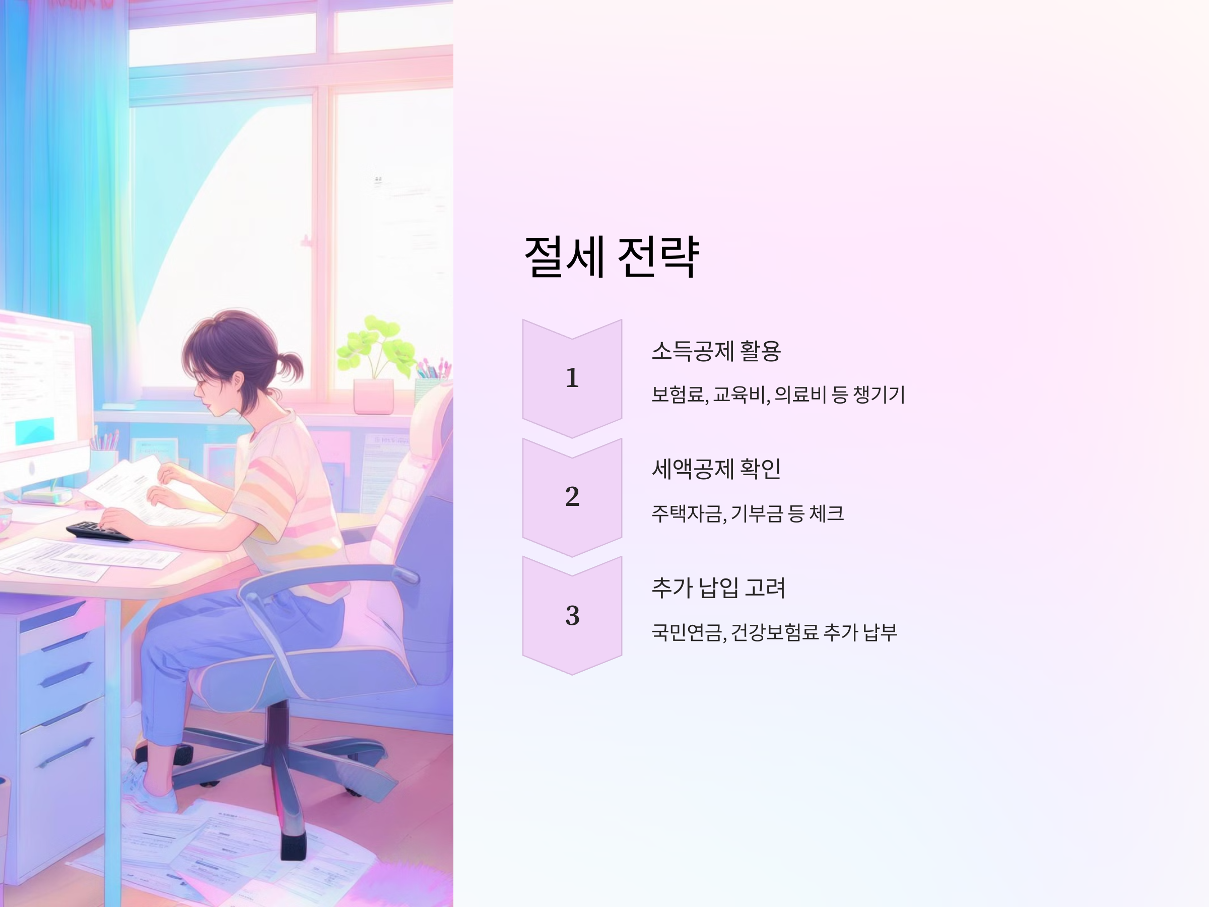 - 세액공제와 소득공제 항목을 최대한 활용한다.