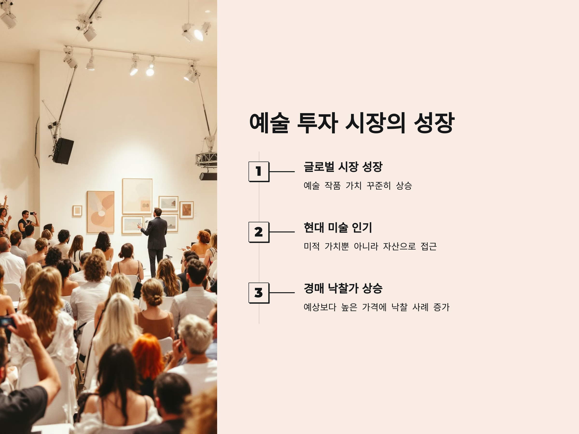 최근 예술 투자 시장은 꾸준히 성장하고 있습니다. 글로벌 시장에서 예술 작품의 가치는 꾸준히 상승하고 있으며, 특히 현대 미술 작품은 큰 인기를 끌고 있습니다. 많은 투자자들이 예술 작품을 단순히 미적인 가치로만 접근하지 않고, 하나의 자산으로서 접근하고 있기 때문입니다. 예술 작품의 가치 상승은 예술계의 변화와 함께 이루어지며, 시간이 지나면서 그 가치는 크게 상승할 수 있습니다.