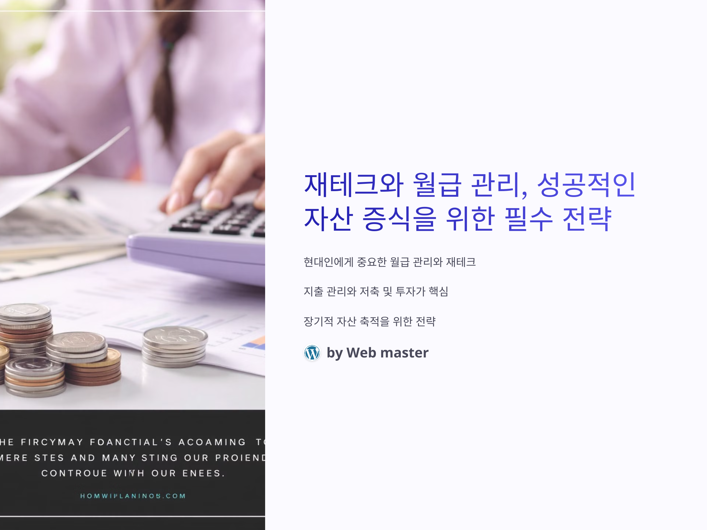 재테크와 월급 관리의 핵심은 ‘지출 관리’와 ‘저축 및 투자’입니다. 월급을 잘 관리하고, 꾸준히 저축 및 투자를 해 나간다면 장기적으로 더 많은 자산을 축적할 수 있습니다. 최근 들어 많은 사람들이 단순히 소비를 줄이기보다는 수익을 높이는 방법에 관심을 가지고 있습니다. 재테크의 시작은 월급 관리에서부터 시작됩니다.