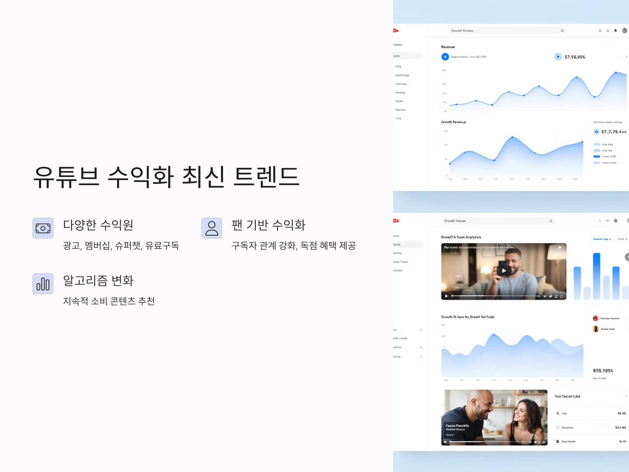 2025년 현재, 유튜브 수익화의 트렌드는 더욱 다양해졌습니다. 이전에는 주로 광고 수익이 주요 수익원으로 자리 잡았지만, 이제는 채널 멤버십, 슈퍼챗, 유료 구독 서비스, 그리고 제품 판매 등 다양한 방법이 생겨났습니다. 특히 "팬 기반 수익화"가 두각을 나타내고 있습니다. 이는 유튜버들이 구독자와의 관계를 더욱 강화하고, 팬들에게 유료 콘텐츠나 독점적인 혜택을 제공하는 방식입니다.