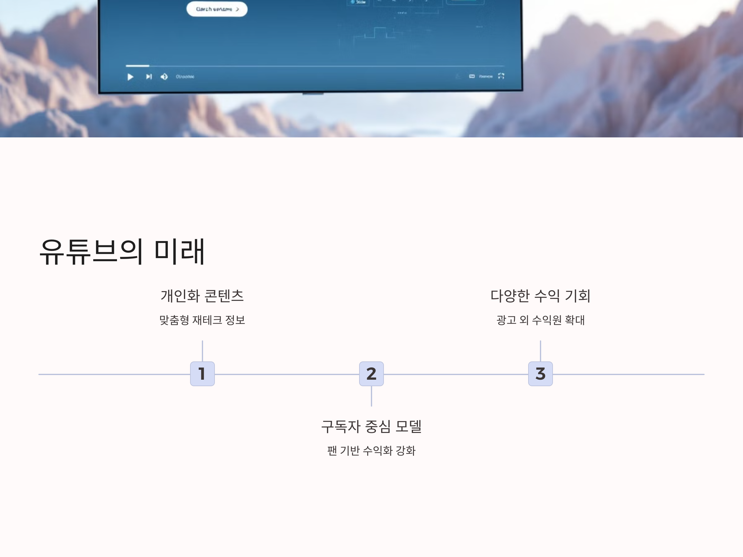 또한, 유튜브의 미래는 더욱 개인화된 콘텐츠 제공과 구독자 중심의 수익 모델을 향해 나아가고 있습니다. 앞으로 유튜브는 광고 수익 외에도 팬 기반 수익화 모델을 강화하며, 유튜버들에게 더 많은 수익 기회를 제공할 것입니다. 재테크와 결합된 유튜브 콘텐츠는 이러한 트렌드에 맞춰 빠르게 성장할 가능성이 높습니다.
