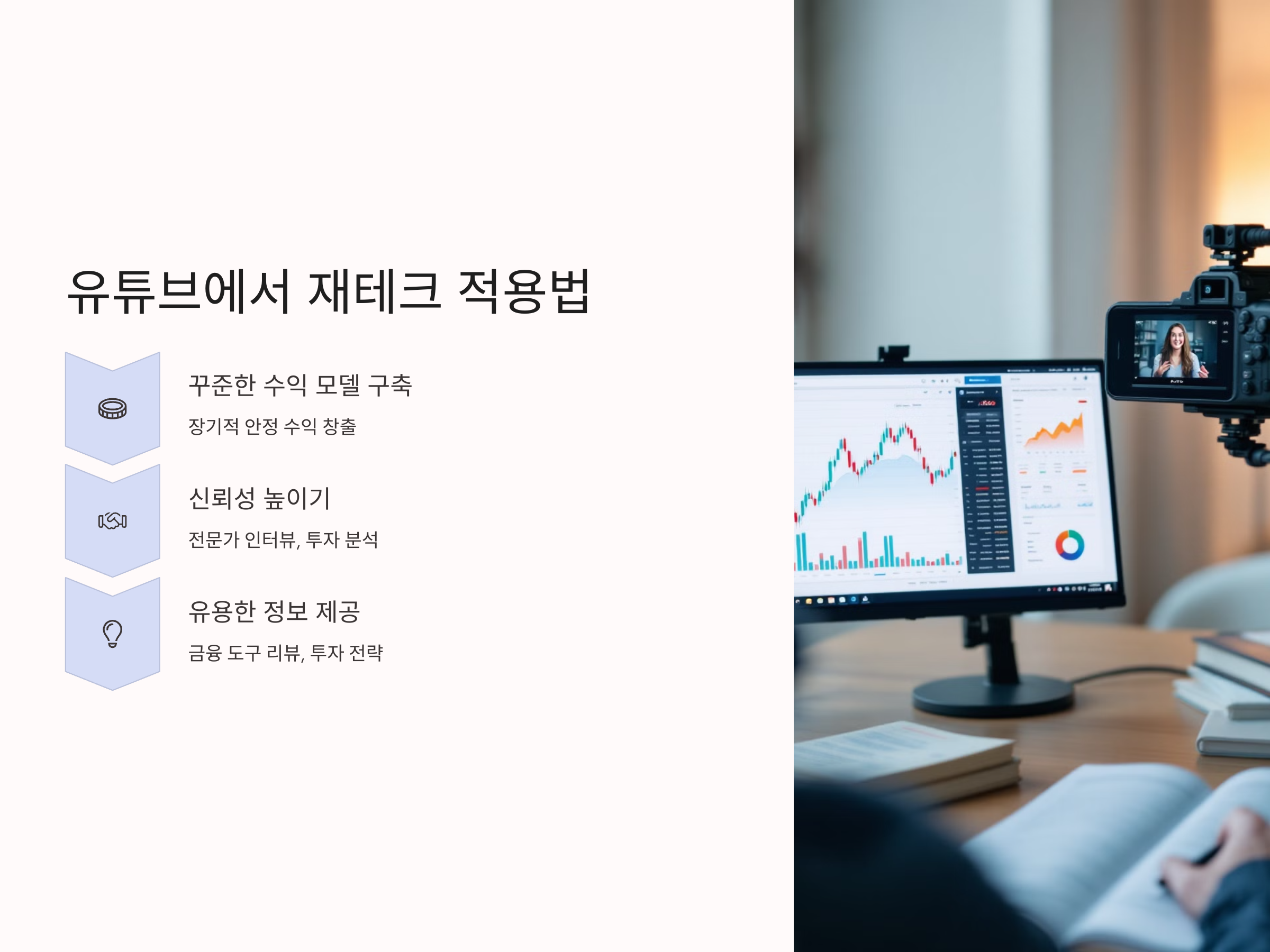 유튜브를 통한 재테크의 핵심은 '꾸준한 수익 모델 구축'입니다. 단기적인 수익보다는 장기적으로 안정적이고 지속 가능한 수익을 창출하는 것이 중요합니다. 이를 위해 유튜버들은 투자와 관련된 콘텐츠, 경제적 자유를 얻을 수 있는 전략 등을 다루며, 점차적으로 수익을 축적해 나가는 방안을 모색합니다. 예를 들어, 주식 투자, 부동산 투자, 펀드 투자 등 다양한 재테크 전략을 유튜브 콘텐츠로 다룰 수 있습니다.