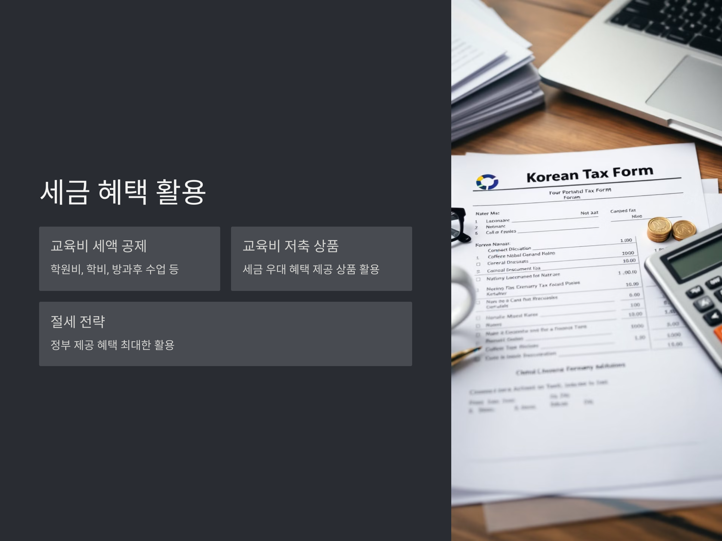 자녀 교육비 마련을 위한 또 다른 중요한 전략은 세금 혜택을 활용하는 것입니다. 정부는 자녀의 교육비와 관련된 다양한 세금 혜택을 제공하고 있습니다. 예를 들어, 교육비에 대한 세액 공제나 교육비 저축을 위한 세금 우대 상품 등이 있습니다.