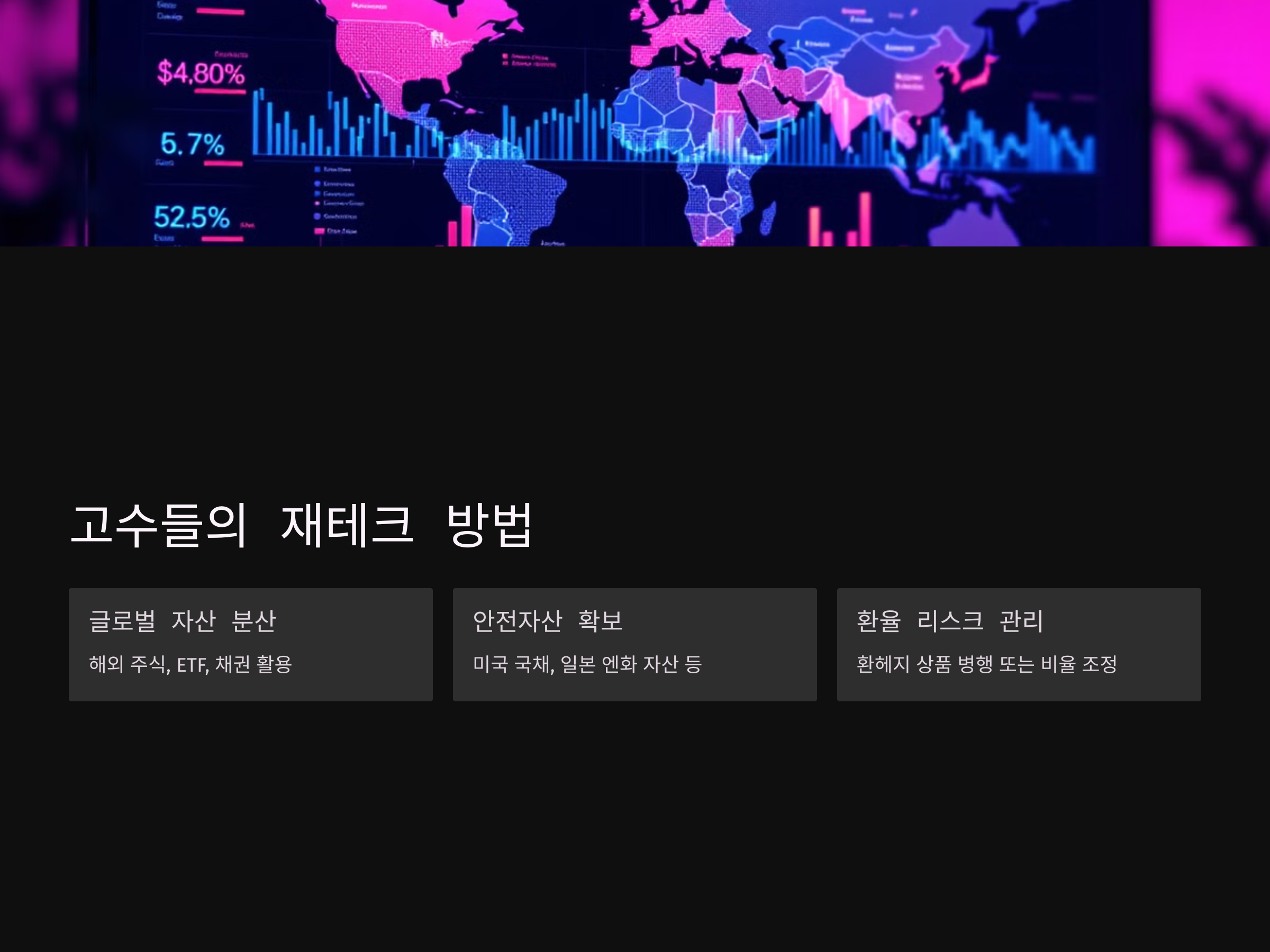 고수들은 국내 자산에만 집중하지 않고 글로벌 자산에도 눈을 돌립니다. 해외 주식, ETF, 채권 등으로 분산 투자해 환율 변동과 글로벌 시장 변동성에도 대비합니다. 최근에는 미국 국채, 일본 엔화 자산 등도 인기인데, 이는 안전자산으로 분류되면서도 안정적인 수익을 기대할 수 있기 때문입니다. 다만, 환율 리스크도 함께 고려해야 하므로, 환헤지 상품을 병행하거나 일정 비율로만 투자하는 전략이 필요합니다. 또한, 글로벌 ETF를 통해 다양한 국가에 분산 투자하는 것도 리스크를 낮추고 수익률을 높이는 좋은 방법입니다.