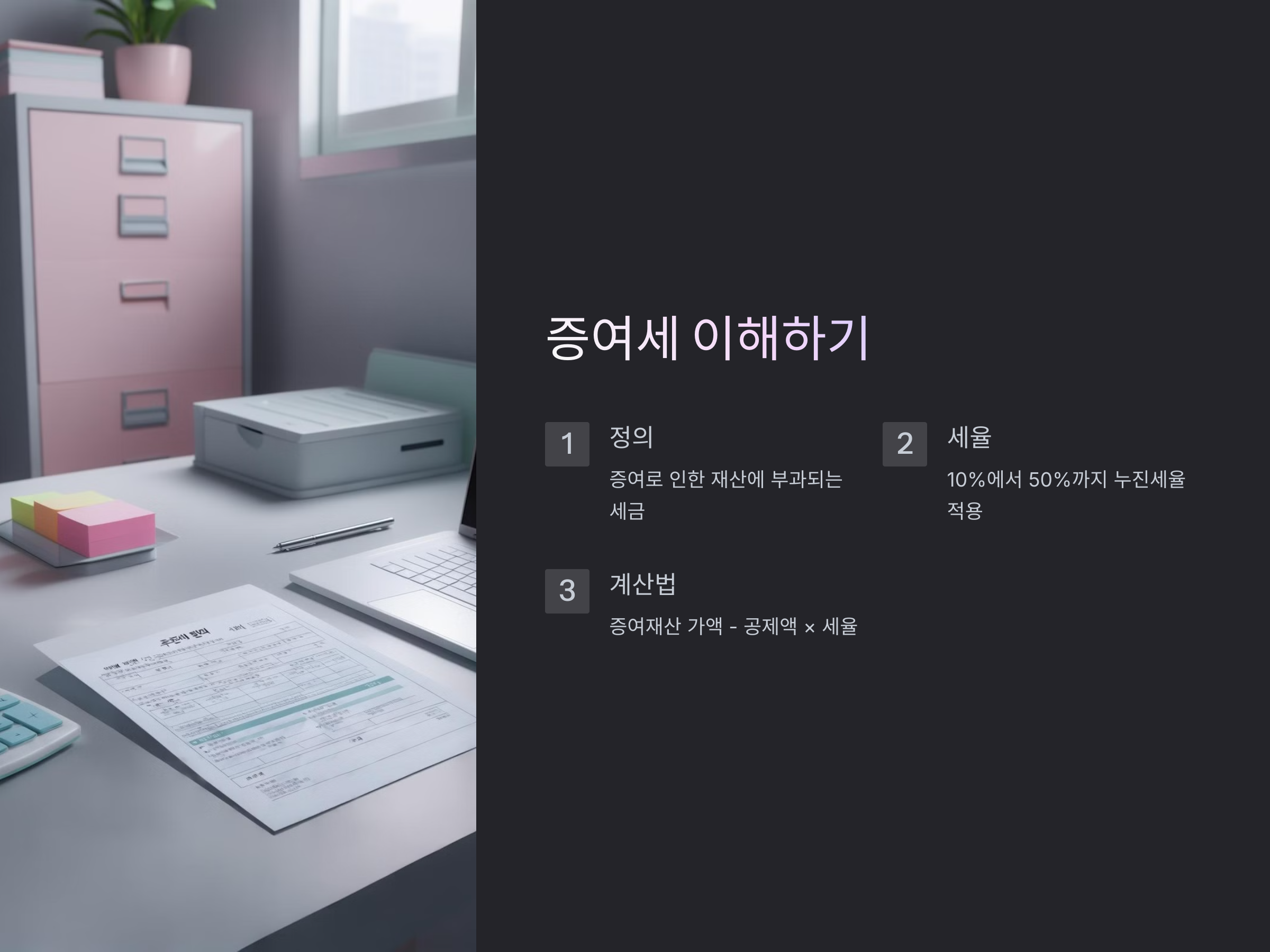증여세를 계산할 때는 증여재산의 가액에서 공제액을 빼고, 그에 해당하는 세율을 곱해서 산출합니다. 예를 들어, 1억 원을 증여했다면, 기본 공제액인 5천만 원을 제외하고 나면 5천만 원에 대해 세금이 부과됩니다.