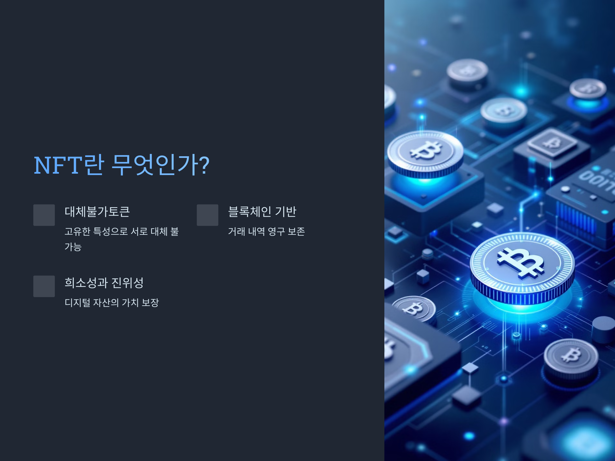 NFT는 ‘Non-Fungible Token’의 약자로, ‘대체불가토큰’이라고도 불립니다. 기본적으로, 대체불가란 특정 자산이 다른 자산으로 교환될 수 없다는 의미로, 각 NFT는 고유한 특성을 가지고 있기 때문에 서로 대체할 수 없습니다. 예를 들어, 디지털 예술 작품은 각기 다른 가치를 지니며, 그 자체로 유일무이한 자산으로 취급됩니다. NFT는 주로 블록체인 기술을 통해 거래되며, 거래 내역이 기록되어 영구적으로 보존됩니다.