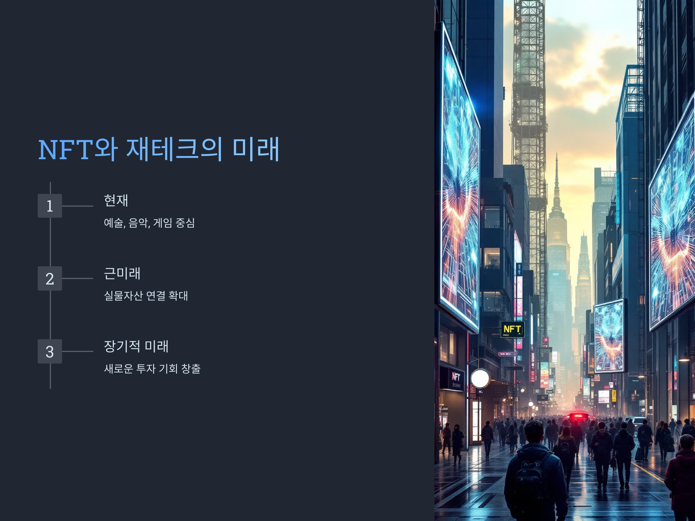 NFT는 아직 초기 단계에 있지만, 그 발전 가능성은 매우 큽니다. 특히, NFT가 예술, 음악, 게임, 스포츠 등의 분야뿐만 아니라, 부동산, 상장 기업 주식, 심지어는 고용계약서와 같은 실물 자산과도 연결될 수 있는 가능성을 열어두고 있습니다. 미래에는 NFT가 더 다양한 분야에서 활용될 것으로 예상되며, 이를 기반으로 한 새로운 투자 기회가 등장할 것입니다.