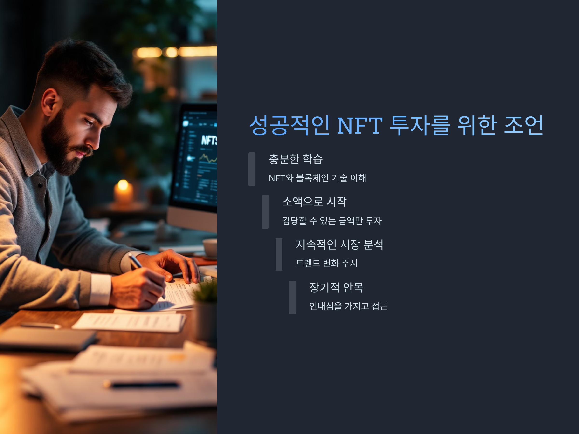 하지만, NFT 투자는 여전히 불확실한 면이 많고, 빠르게 변화하는 시장 환경에 대한 적응력이 중요합니다. 따라서 NFT 투자를 고려하는 사람들은 장기적인 안목을 가지고, 신중하게 접근해야 하며, 끊임없이 변화하는 시장에서 자신만의 투자 전략을 세워 나가는 것이 중요합니다.