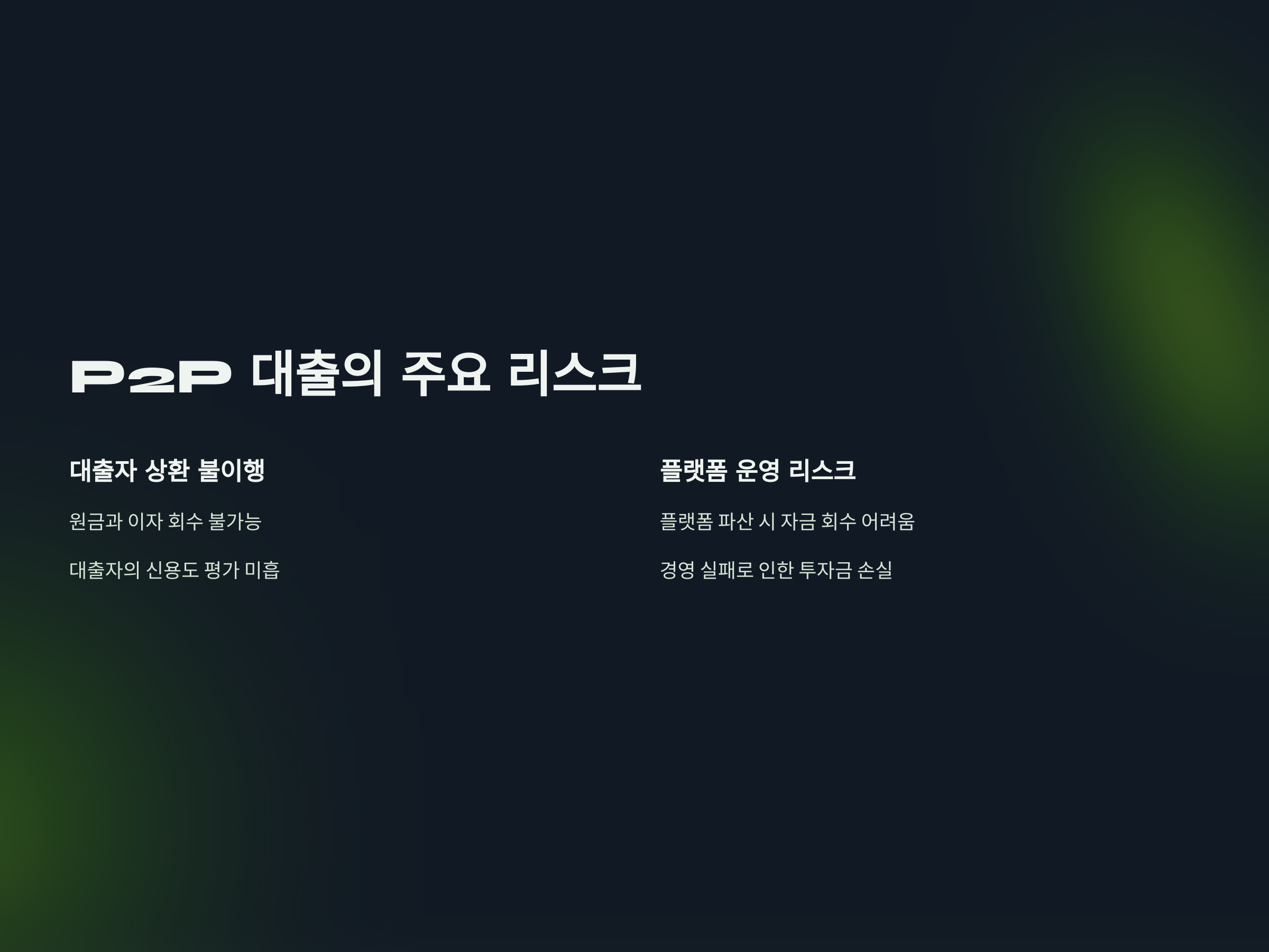P2P 대출의 리스크는 크게 두 가지로 나눌 수 있습니다. 첫 번째는 대출자의 상환 불이행 리스크입니다. 대출자가 예상보다 빨리 상환할 수 없는 상황에 처할 수 있으며, 이로 인해 투자자가 원금과 이자를 회수하지 못하는 상황이 발생할 수 있습니다. 두 번째는 플랫폼의 운영 리스크입니다. P2P 대출 플랫폼이 사업 부진이나 경영 실패 등의 이유로 파산하게 되면, 투자자는 이미 투자한 자금을 회수하지 못할 수 있습니다.