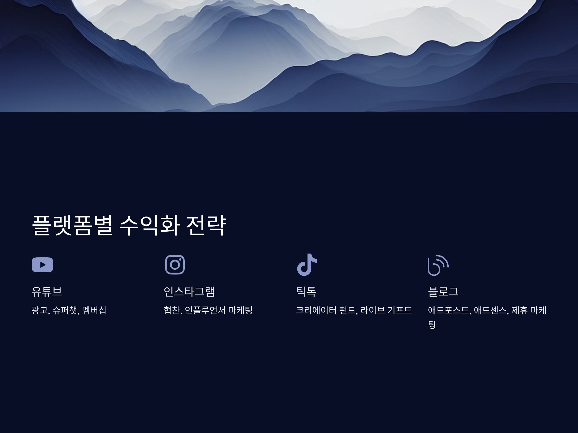 - 수익 모델: 광고 수익, 슈퍼챗, 멤버십, 제휴 마케팅, 자체 상품 판매