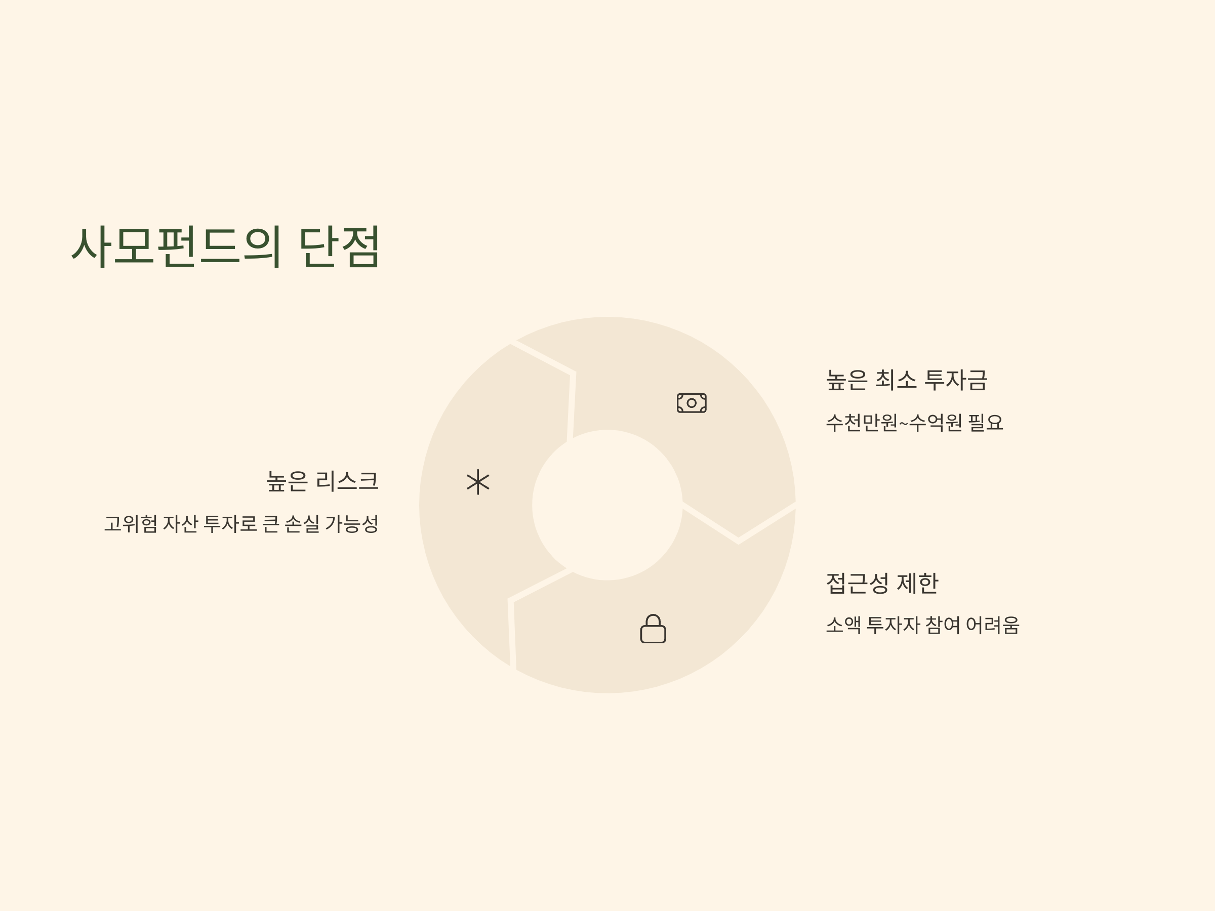 또한 사모펀드는 최소 투자 금액이 크기 때문에, 소액 투자자들이 접근하기 어려운 경우가 많습니다. 일반적으로 사모펀드에 투자하기 위해서는 최소 수천만 원에서 수억 원에 달하는 자금을 투자해야 하는 경우가 많아, 자금력이 부족한 개인 투자자들에게는 장벽이 될 수 있습니다.