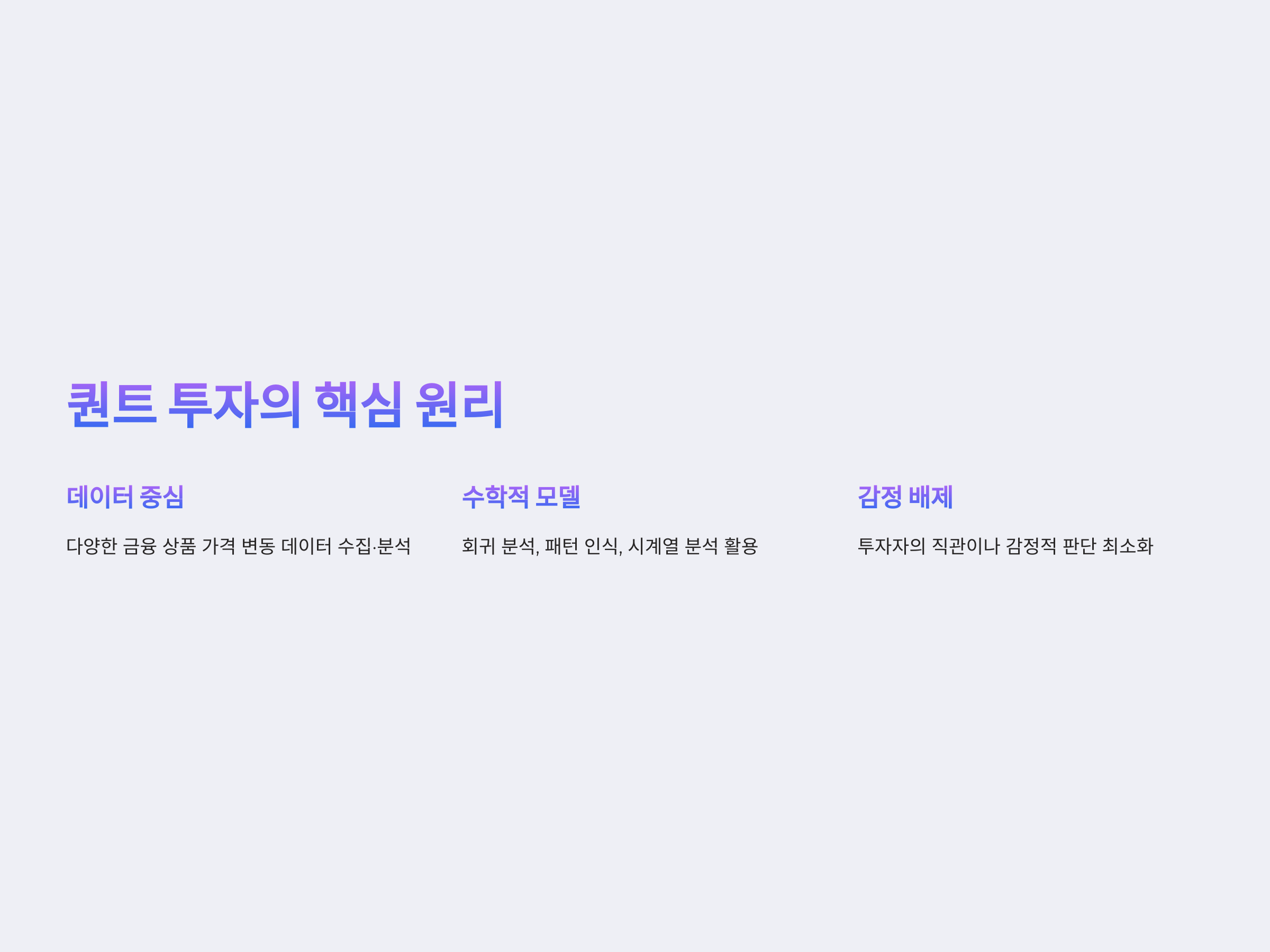 퀀트 투자(Quantitative Investment)는 수학적, 통계적 모델과 알고리즘을 활용하여 투자 결정을 내리는 투자 방식입니다. 즉, 사람의 감정이나 직관이 아니라 수많은 데이터를 분석하여 투자 전략을 세우고, 그 전략을 자동으로 실행하는 방식입니다. 최근에는 AI와 머신러닝 기법까지 결합하여 점점 더 정교하고 고도화된 퀀트 투자 방법들이 등장하고 있습니다.