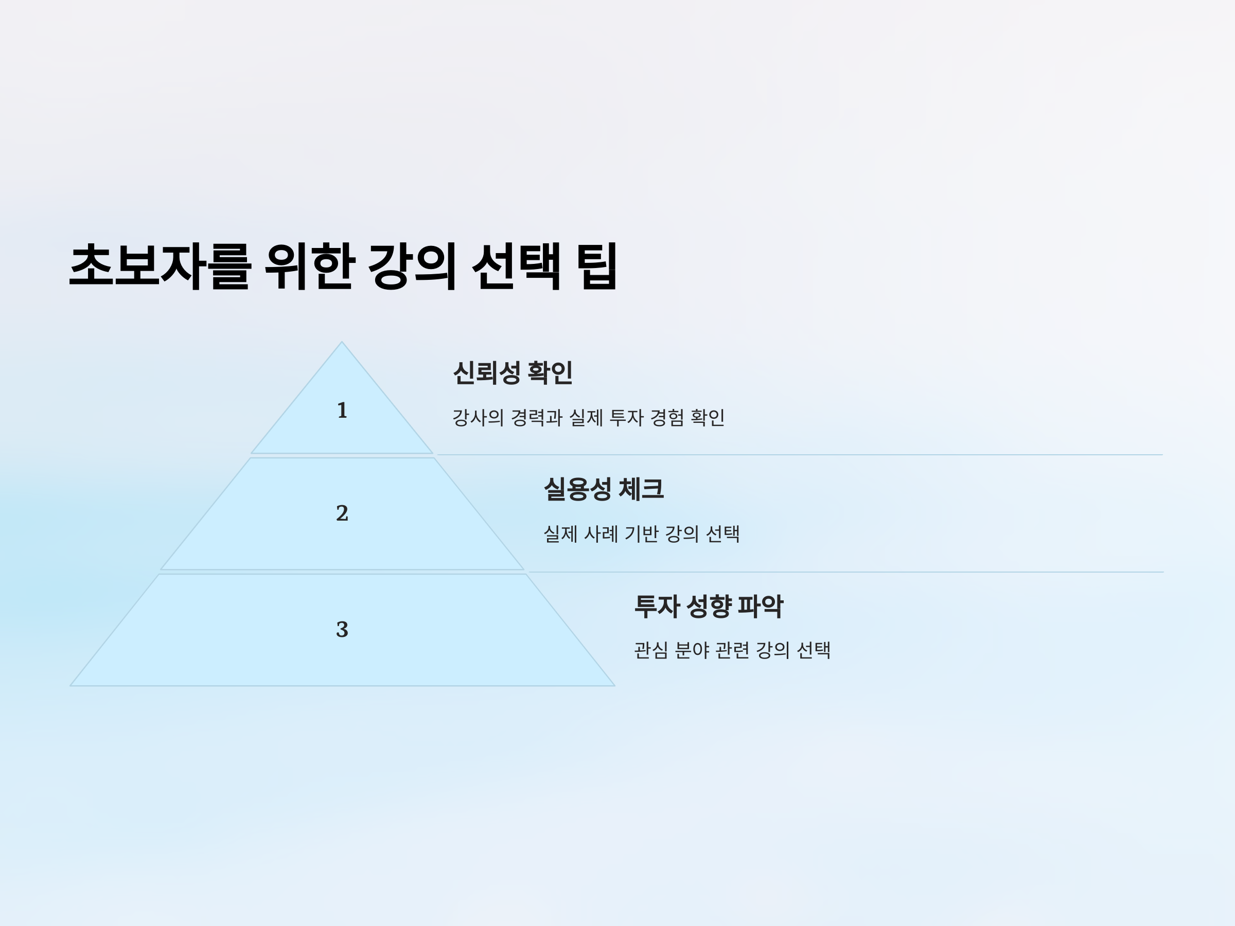 초보자가 재테크 강의를 선택할 때는 몇 가지 주의할 점이 있습니다. 첫째, 자신의 투자 성향을 잘 파악하는 것이 중요합니다. 주식, 부동산, 암호화폐 등 다양한 투자처가 있는데, 자신이 가장 관심 있는 분야와 관련된 강의를 선택하는 것이 효율적입니다. 둘째, 강의 내용이 실용적인지 체크해야 합니다. 이론만 다루는 강의보다는 실제 사례를 바탕으로 강의가 진행되는 것이 더 유익합니다. 셋째, 강사의 신뢰성과 경력도 중요한 판단 기준입니다. 강사가 실제로 투자 경험이 많고, 강의에서 다루는 내용이 현실적인지 파악하는 것이 중요합니다.