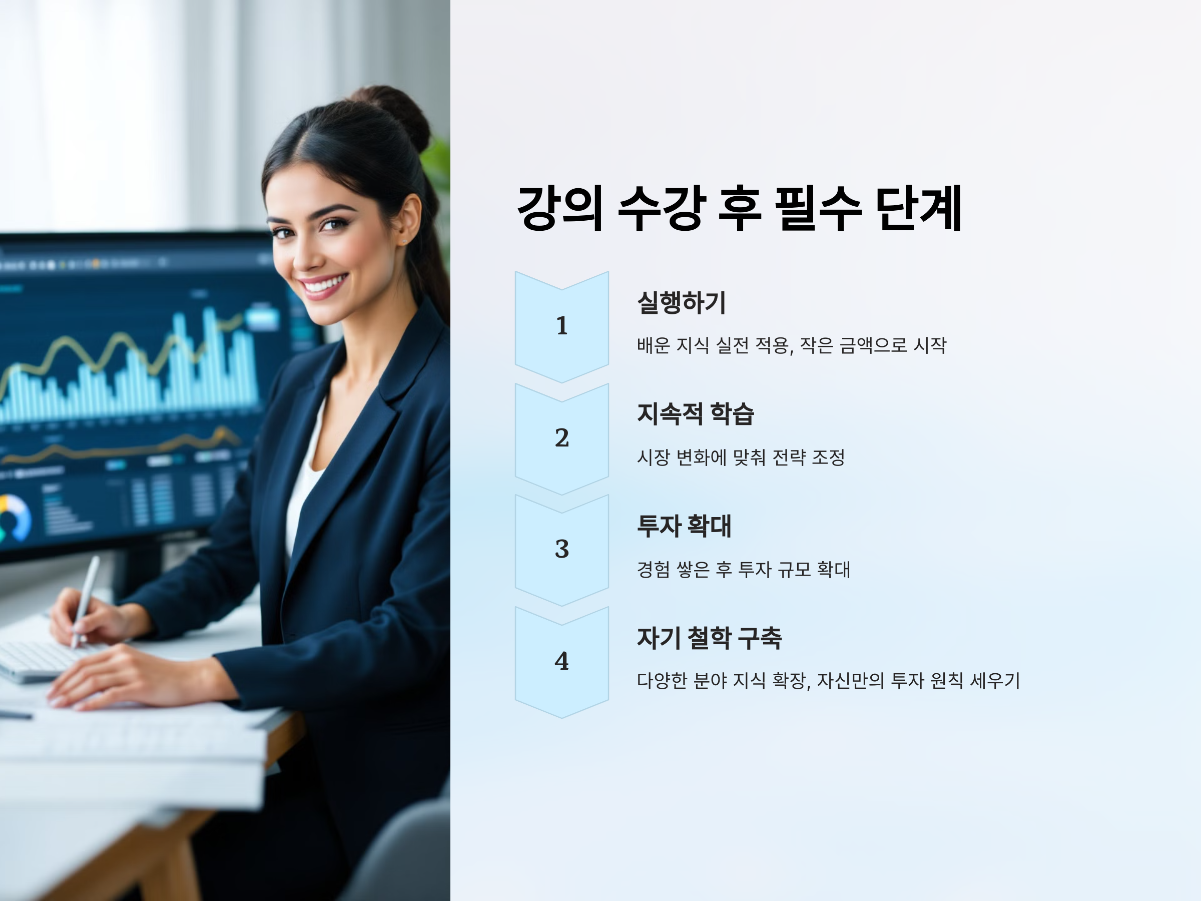 재테크 강의를 수강한 후에는 반드시 실행이 중요합니다. 공부만 하고 실제로 실행하지 않으면 아무 의미가 없겠죠? 강의를 통해 배운 지식을 실전에서 적용해 보세요. 처음에는 작은 금액으로 시작해 경험을 쌓고, 점차 투자 규모를 확대해 나가는 것이 좋은 전략입니다.