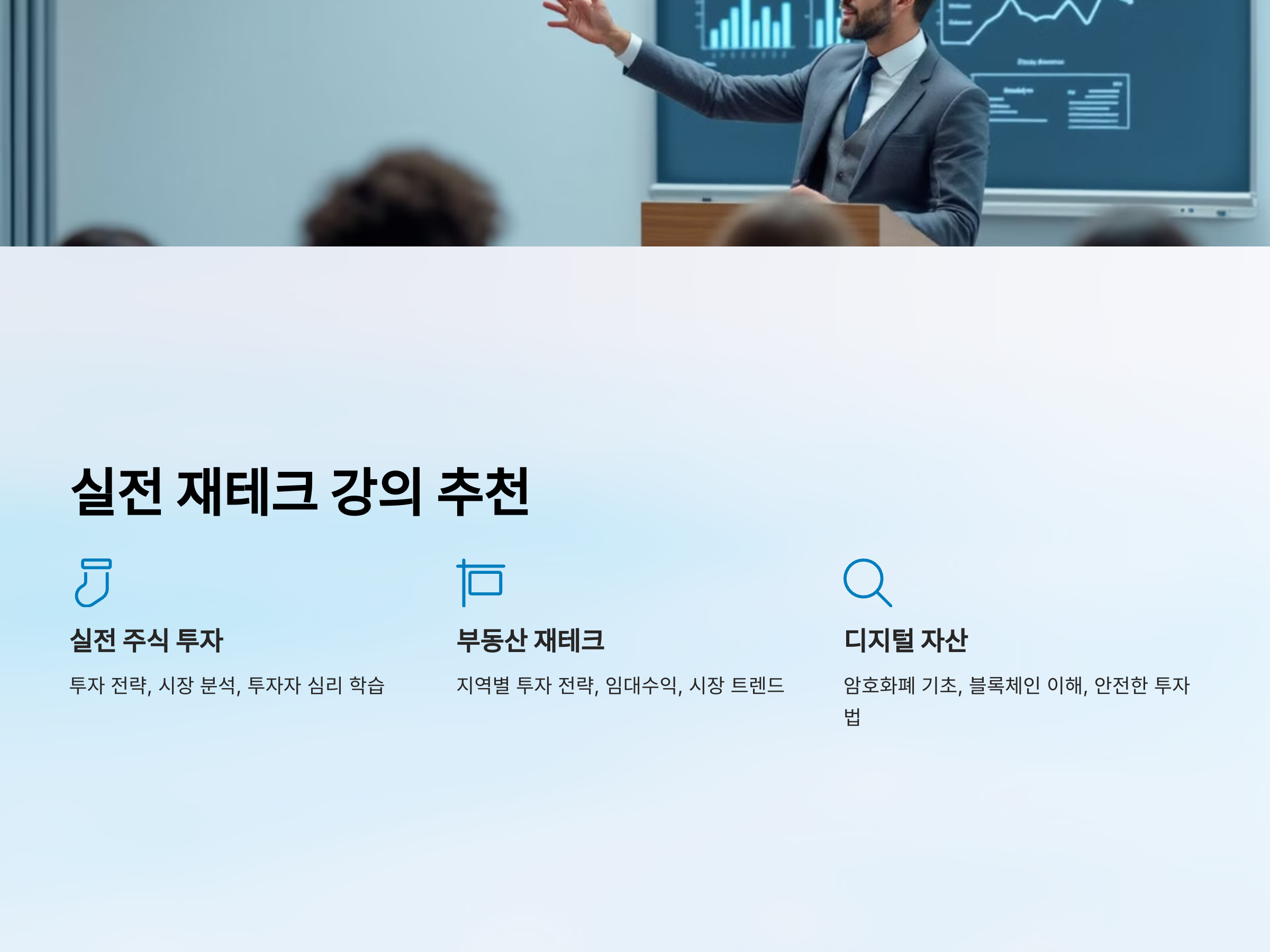 단순히 이론적인 강의보다는 실전적인 강의를 듣는 것이 중요합니다. 실전에서 바로 적용할 수 있는 재테크 전략을 배울 수 있는 강의가 정말 필요합니다. 예를 들어, "실전 주식 투자" 강의는 실제 시장에서의 투자 전략을 배울 수 있어 매우 유용합니다. 주식이나 펀드 투자에 대한 기본적인 이론을 다루는 것뿐만 아니라, 투자자의 심리, 시장 분석 방법 등을 실제로 어떻게 활용할 수 있는지에 대해 상세히 설명합니다.