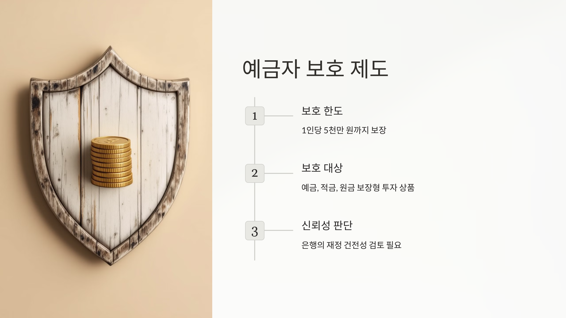 - 보호 한도: 1인당 5천만 원, 동일 은행 내 모든 예금을 포함한 한도.